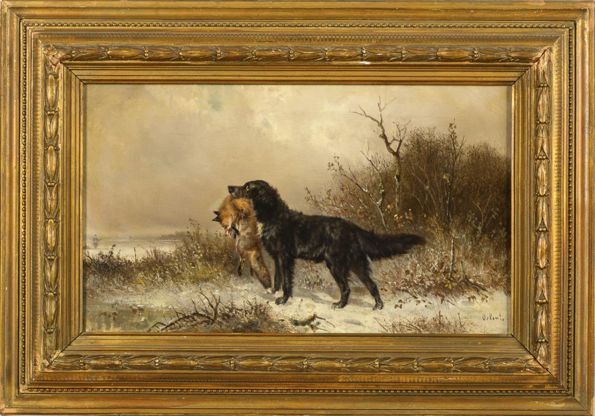 The dog with the hunted animal in the snow near the edge of the forest. Slight traces of age.