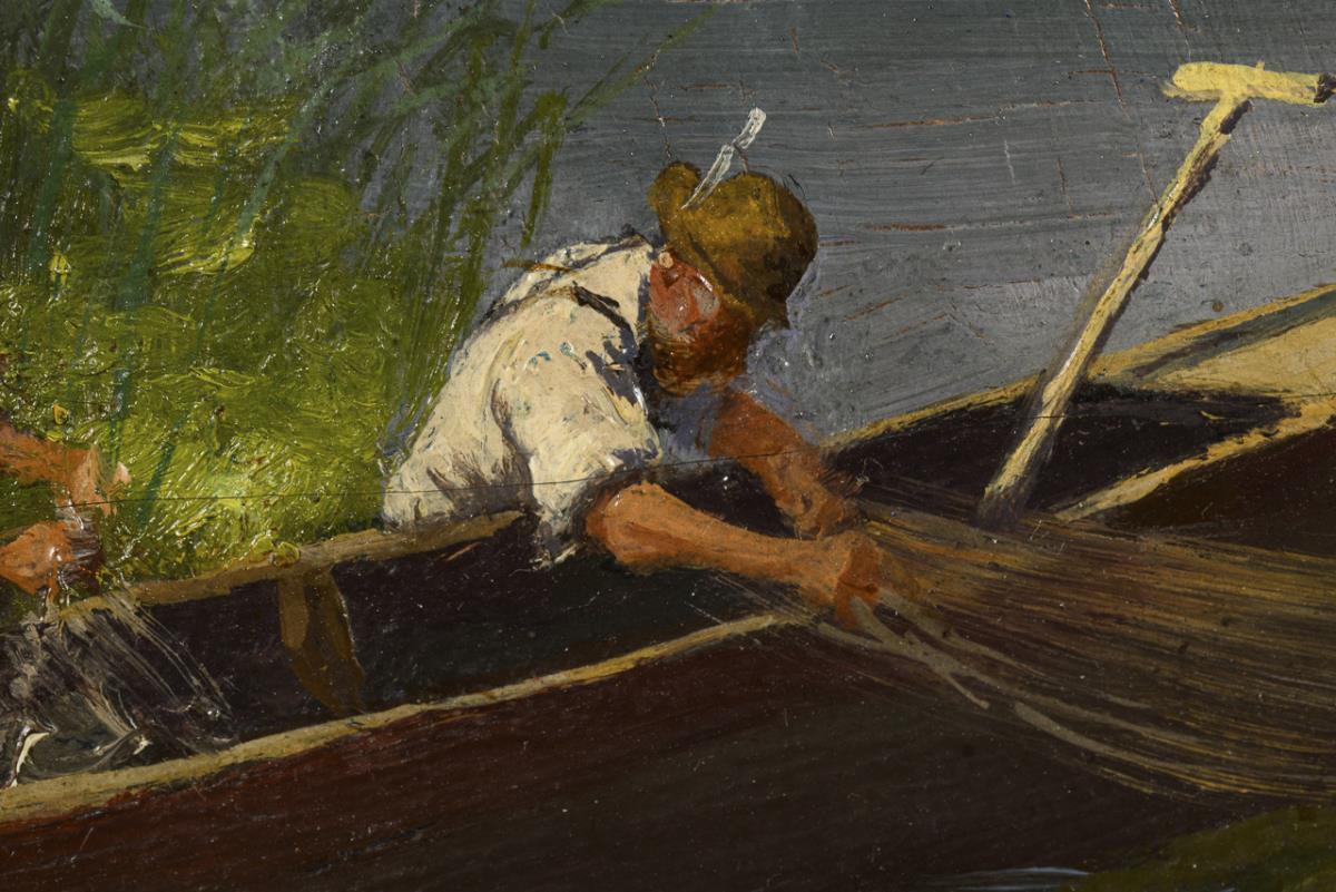 Three men with the nets on the boat in front of the stony shore in the sunshine.