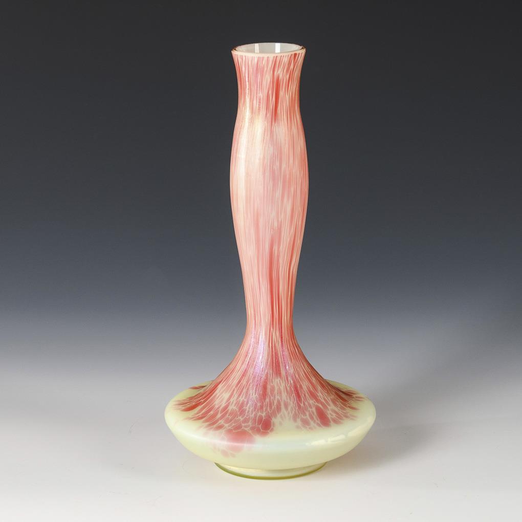 Narrow-necked vase made of clear glass with opal white interior and pinkish-white crumb melts, iridescent; pontil mark.