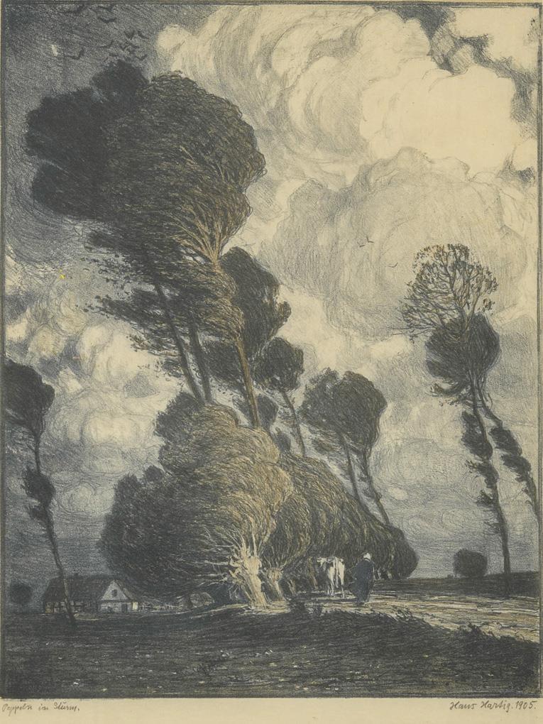View of a cluster of trees, probably poplars, in a strong wind with birds flying away, a cow and a figure in a coat, behind it a farmstead with 2 recognizable houses, 1905. Sheet slightly stained in the margin.
