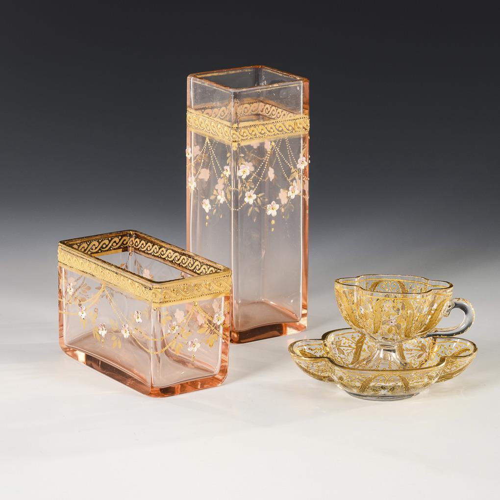 Square vase and rectangular bowl made of pink glass with gold and polychrome enamel-painted flower festoons and meander border (h 15 and 6.5 cm). / Four-pass cup (H 5 cm) and saucer (L 10 cm) with rich gold ornamentation and small enamel flowers, signed "Holzner".