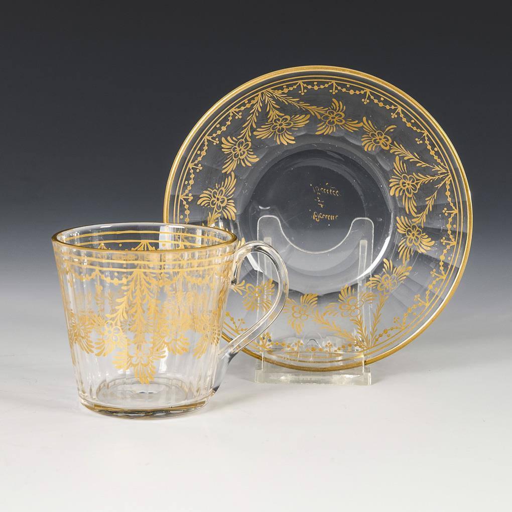 5x lengthwise optically blown: 2 wine glasses with the enamel-painted monogram "HR" (h 13 and 14 cm) and 3 small cups with cut and gold-decorated scattered flowers (h 4.5 cm). / 1 conical, faceted cup (H 6 cm) with saucer (Ø 10.5 cm) and gold-painted floral festoons. 1 small cup with stress crack.