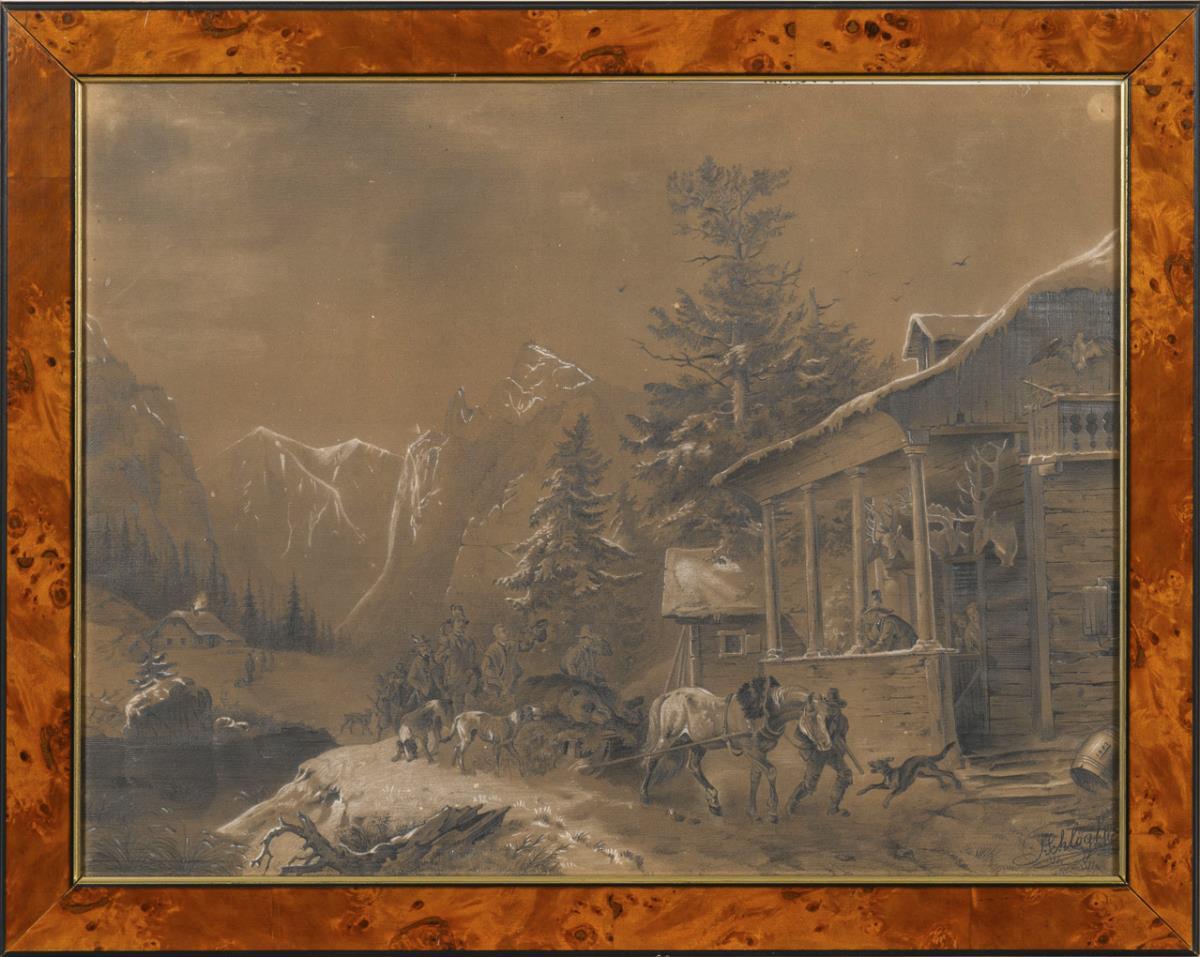 Drawing of a returning hunting party with horse, dogs and hunted game in front of the hunting lodge, behind them a mountain panorama.