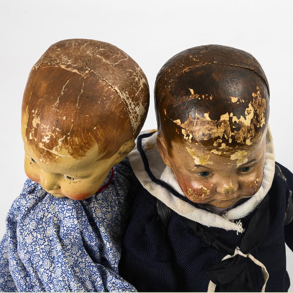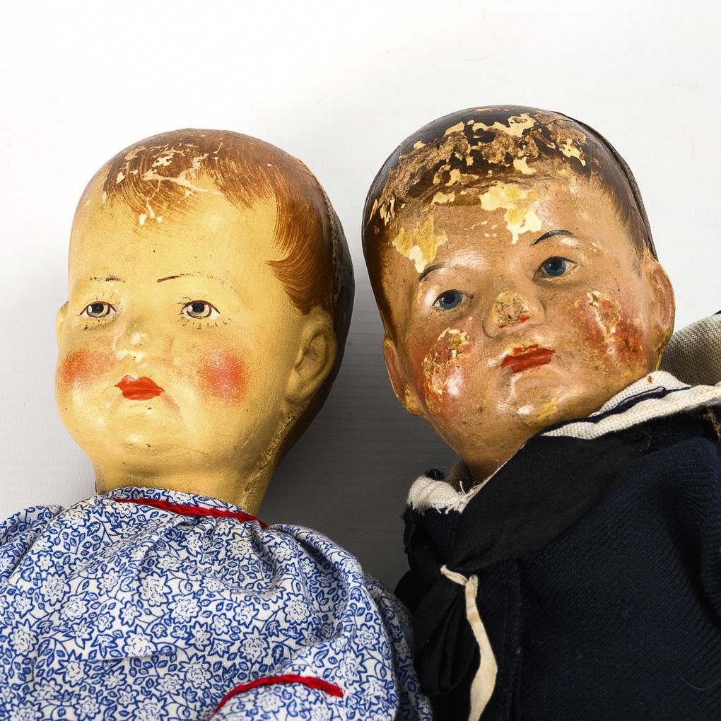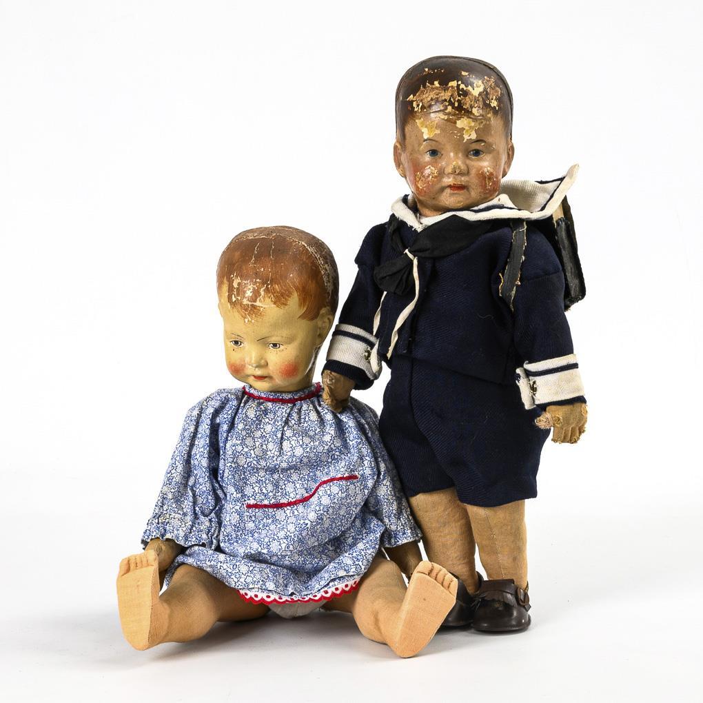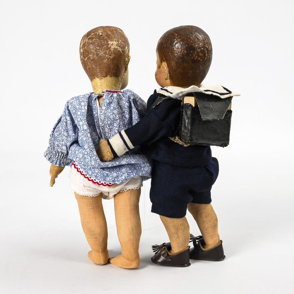 Both with painted fabric crank head, brown hair and fabric body with disc joints. 1x blue patterned dress, L 35 cm. 1x sailor suit, black satchel and brown shoes, l 33.5 cm. Both heavily used, with paint defects to the head, sailor boy with defects and repairs to the hands.