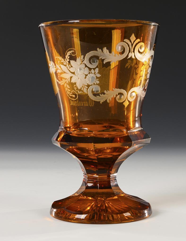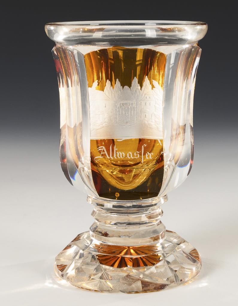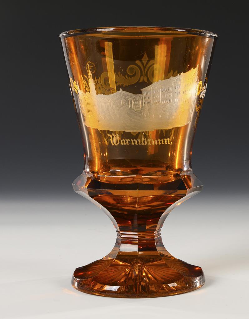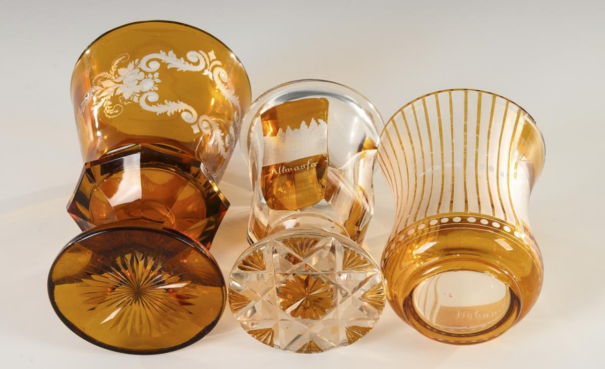 1 goblet with a view of Warmbrunn (h 14.5 cm). / 1 faceted goblet with views of Salzbrunn, Fürstenstein and Altwasser (H 11.5 cm). / 1 beaker with a view of Nenndorf (H 10 cm). 1x minimal foot knocks, 1x minimal knocks to the cut edges.
