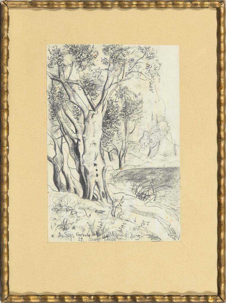 Small sketch of a landscape with groups of trees on a lake shore near Torbole/Lake Garda. Paper slightly stained.