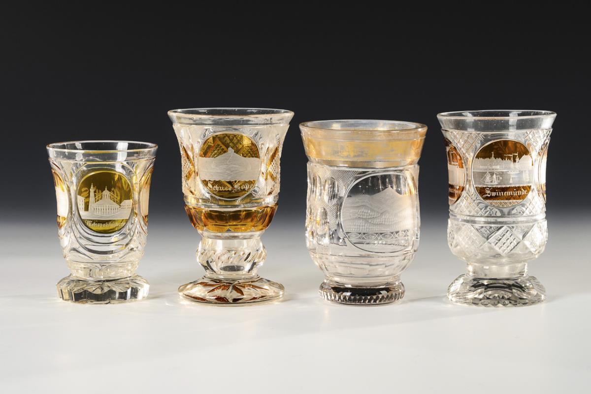 4 different glasses with bell-shaped cuppa, facet, notch, Steinel and partly olive cut. All with engraved and inscribed views (e.g. Schneekoppe, Swinemünde). Gold rubbed, 1x knock to the rim and foot.