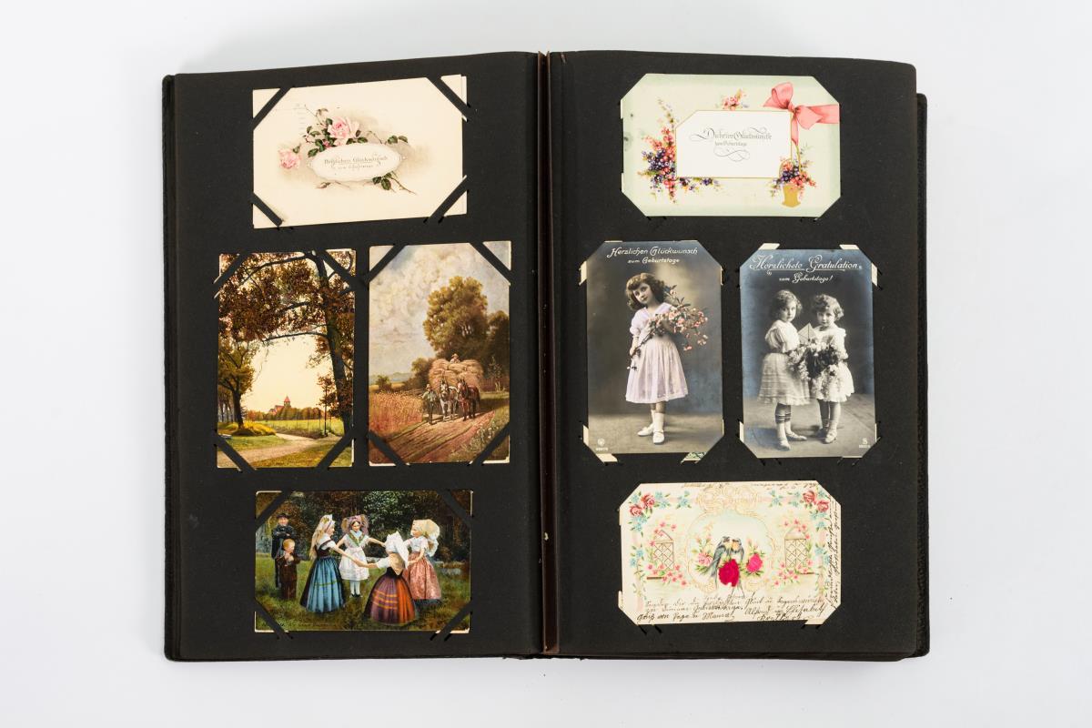 Sehr gehaltvolles Album, darunter "Gruß aus ...", Lithographien und seltene Motivkarten. Schwarzer Ledereinband mit weißen Blüten.