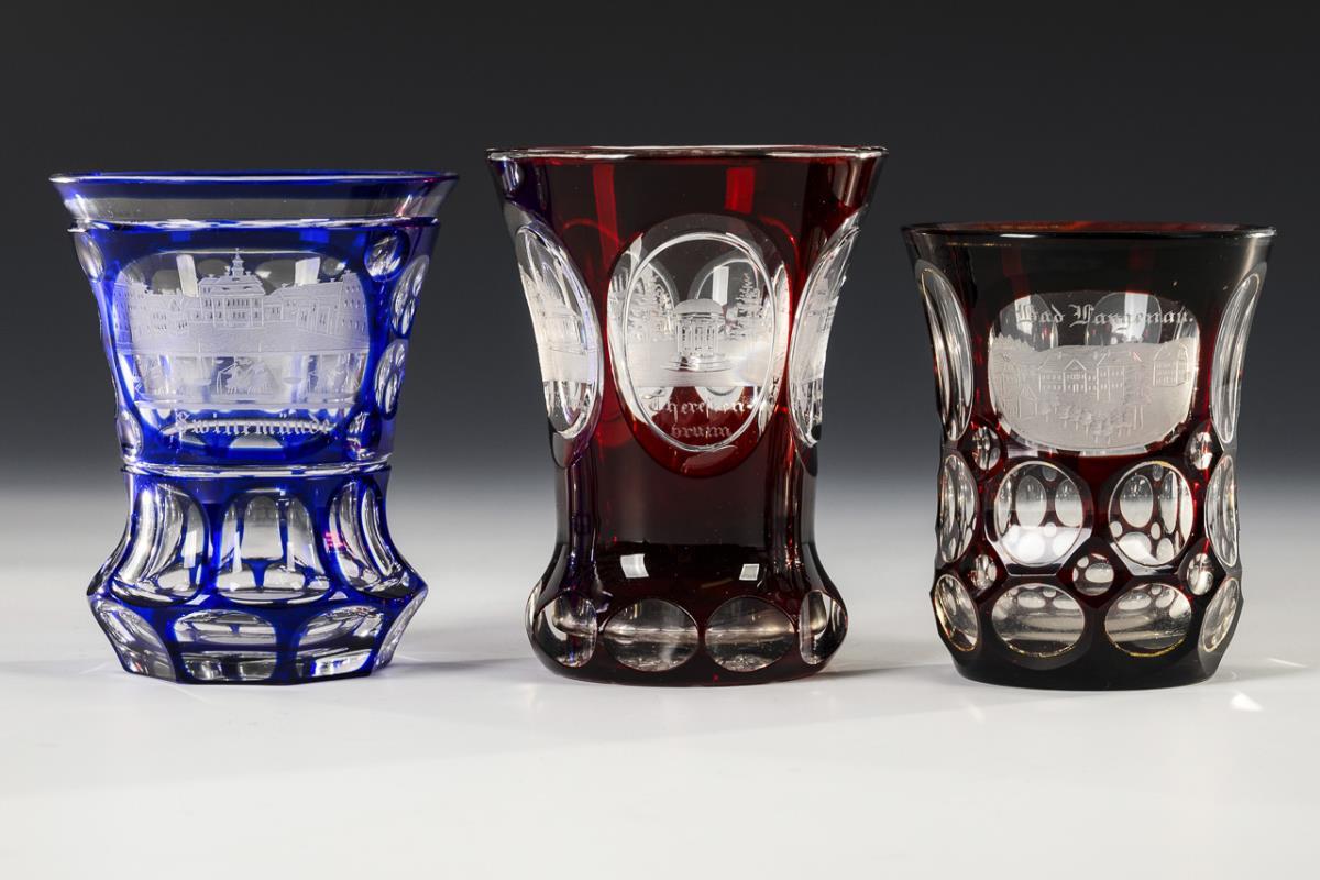 3 crater cups with cut decoration and engraved views (Karlsbad, Swinemünde, Langenau).