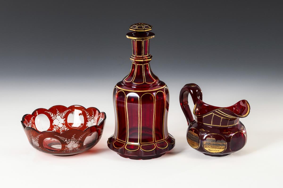 1x faceted carafe with flared, multi-pass stand and stopper (h 22.5 cm). / 1x milk jug with engraved and gold and silver-stamped views of Norderney (H 9.5 cm). / 1x bowl with multi-pass rim and engraved views of Saxon Switzerland (Ø 15 cm). Partial gold abrasion.