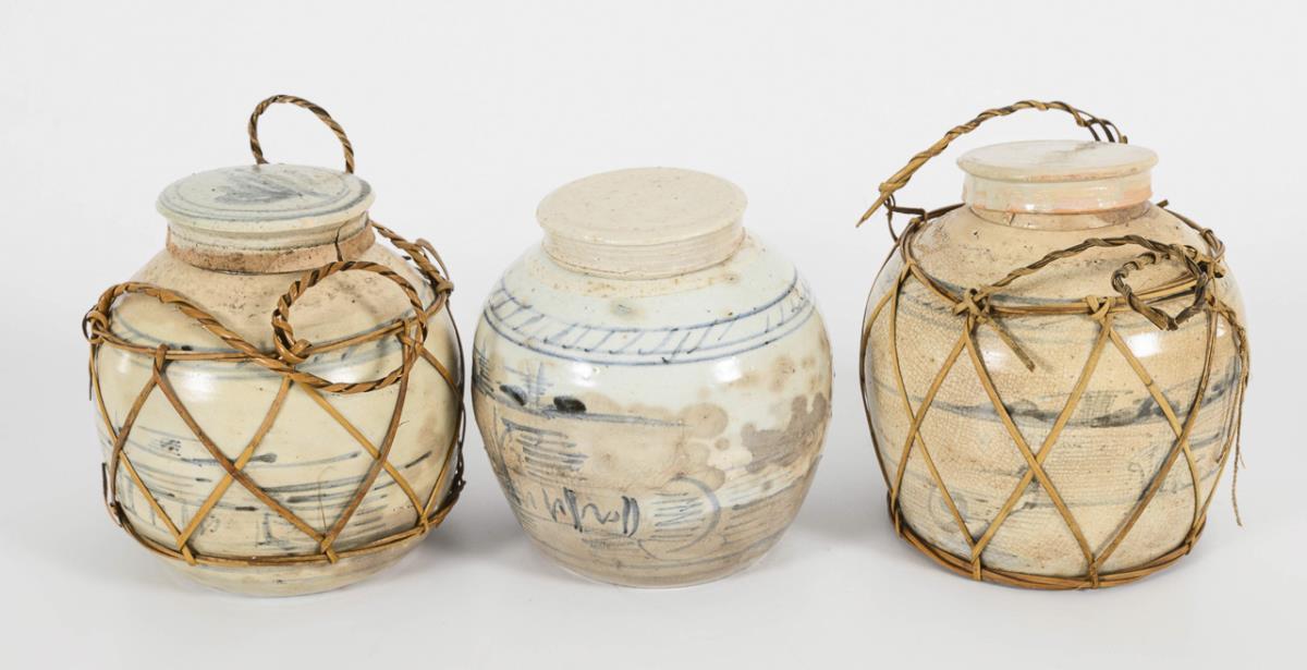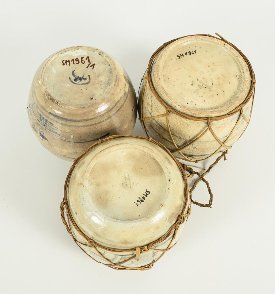 All with stylized water landscape, one lid also painted. No damage; wickerwork in good condition. One lid with fire crack.