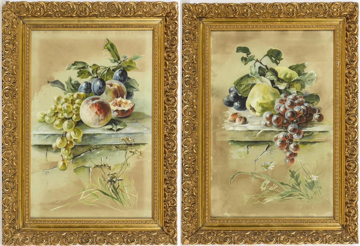 Grapes, quinces and plums on a wall ledge next to hazelnuts as well as peaches next to grapes and plums on the wall. Each with a light border.