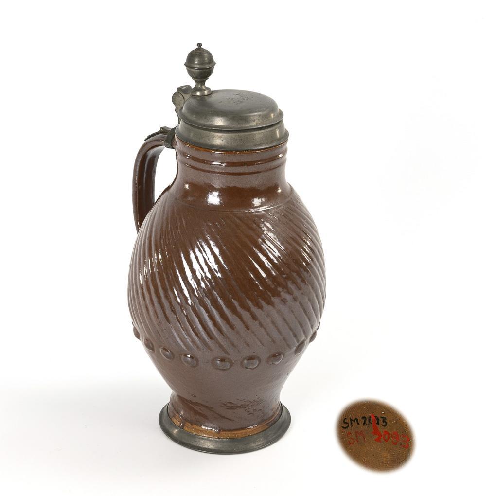 Ovoid body with belted cylindrical neck, diagonally ribbed wall and row of knobs, strap handle. Pewter lid with ball pusher, monogrammed and dated "E.R.N. 1803", pewter stand ring. Tin mounting with defect.