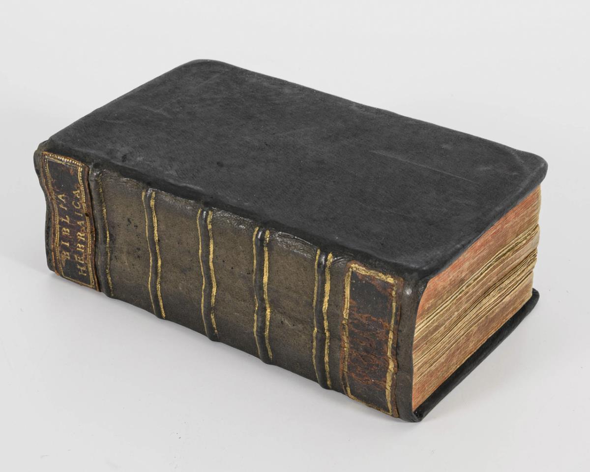 In Latin and Hebrew. Cura et studio Johannis Simonis. Editio secunda emendatior. 16, 1334, 79, 75, 48 pages. With binding: Johanne Simonis "Analysis et explicatio lectionum masorethicarum, Kethiban et Karjan" /Joahnne Simonis "Dictionarium veteris testamenti Hebraeo-Chaldaicum ..." / "Explicatio epicriseon masorethicarum ...". Leather binding.