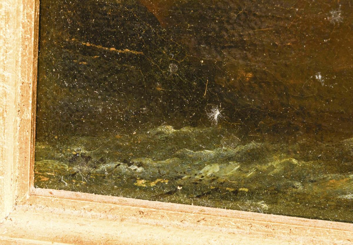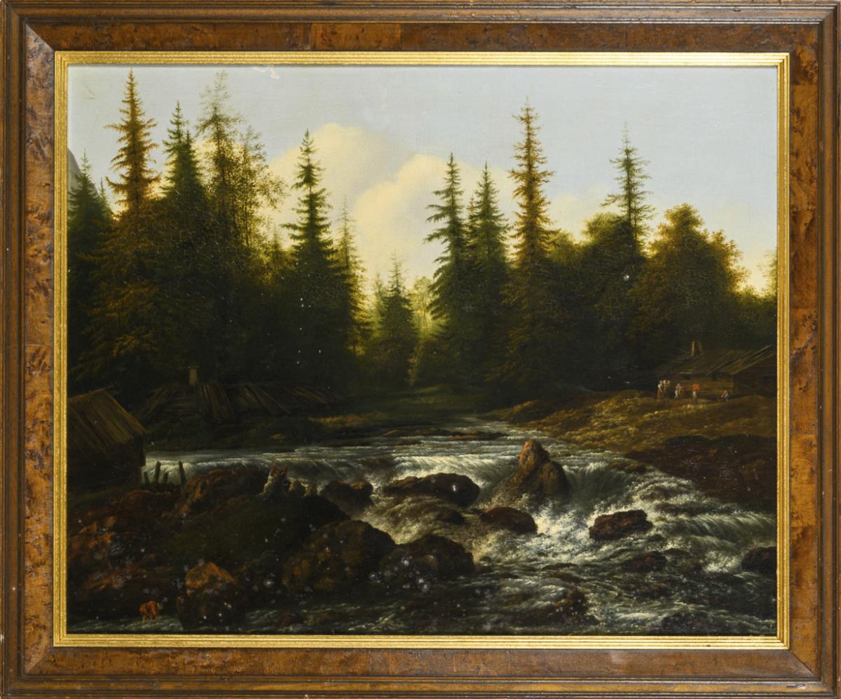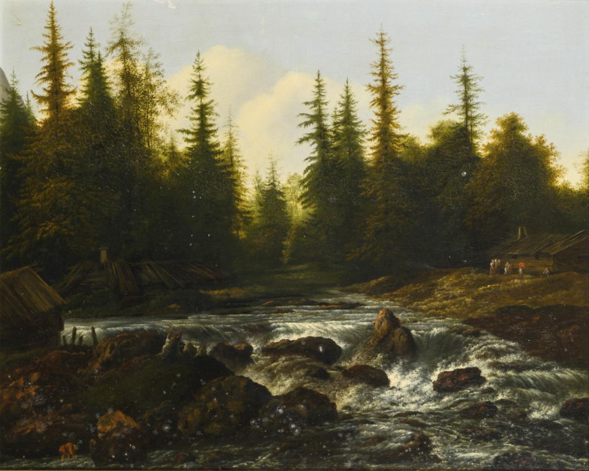Rocky riverbed with huts in front of the pine forest in the evening. Canvas mounted, scratches.
