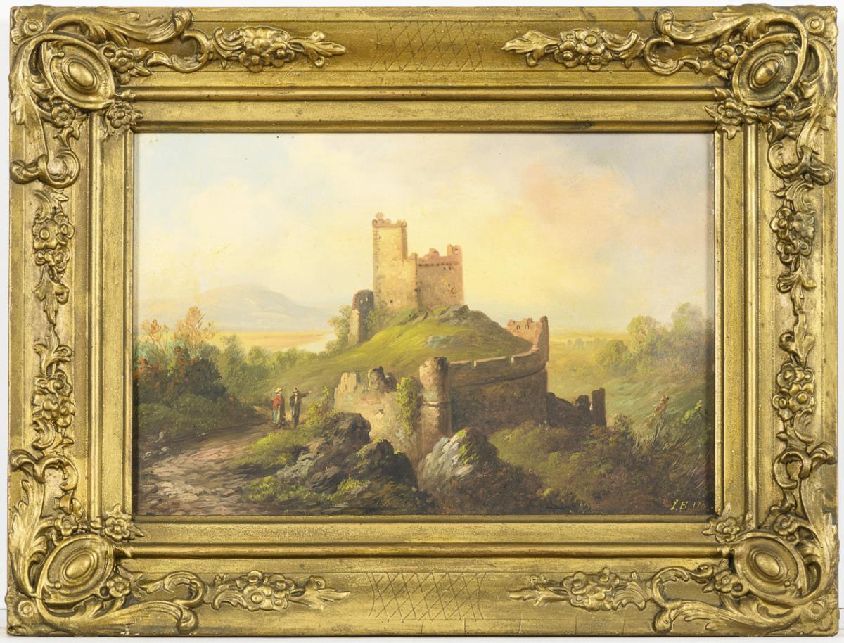 A couple on a path near the ruins in the sunshine with a view over the wide plain with the river.