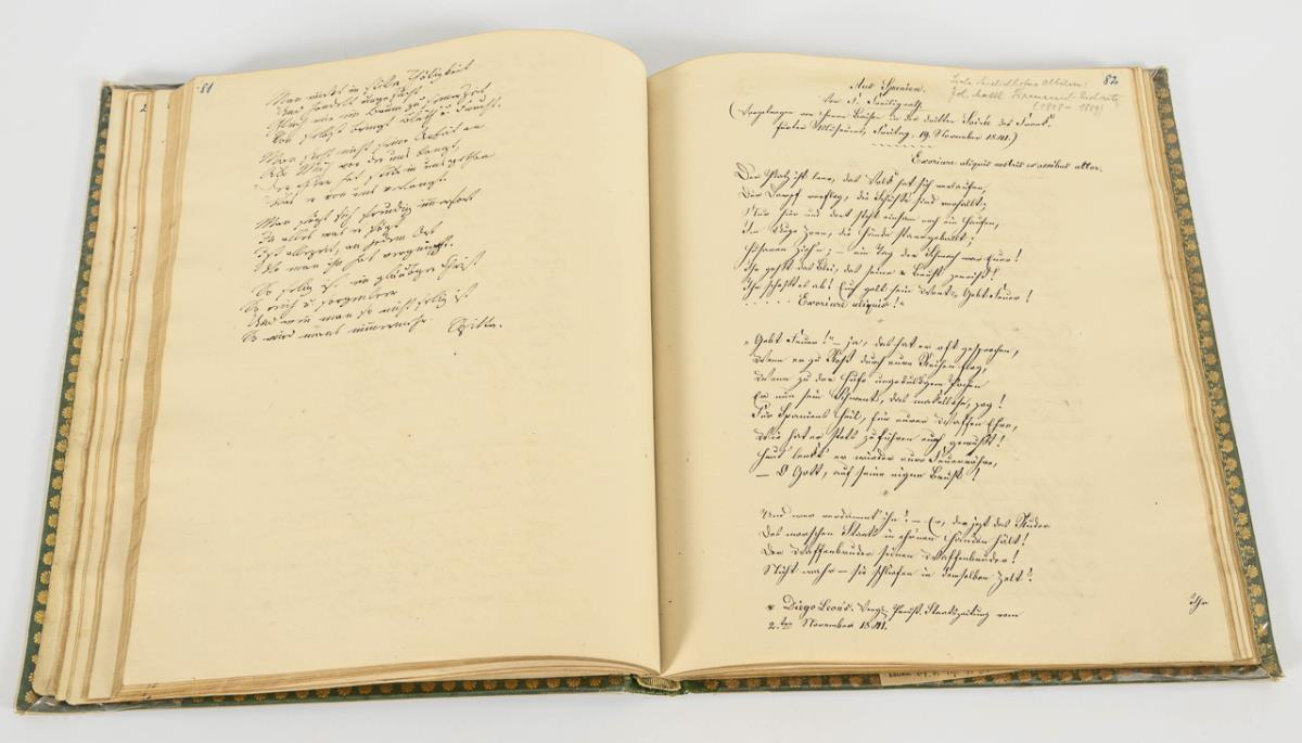 Probably original owner: Princess Louise zu Bentheim und Steinfurt. Autographs: Carl von Spiegel, Melanie von Spiegel, Frederike Krackow, Albertine Marschall, Louise von Egloffstein, August Marschall, Wolley, Mechthilde Weyland, Stolberg, Mathilde Bertuch, Isabelle von Egloffstein, Marie Herder and others. The book includes guest entries, copies of poems, family entries, written explanations and additions and 20th century (World War II) copies of the Krafft family. Green leather binding with gold embossing.