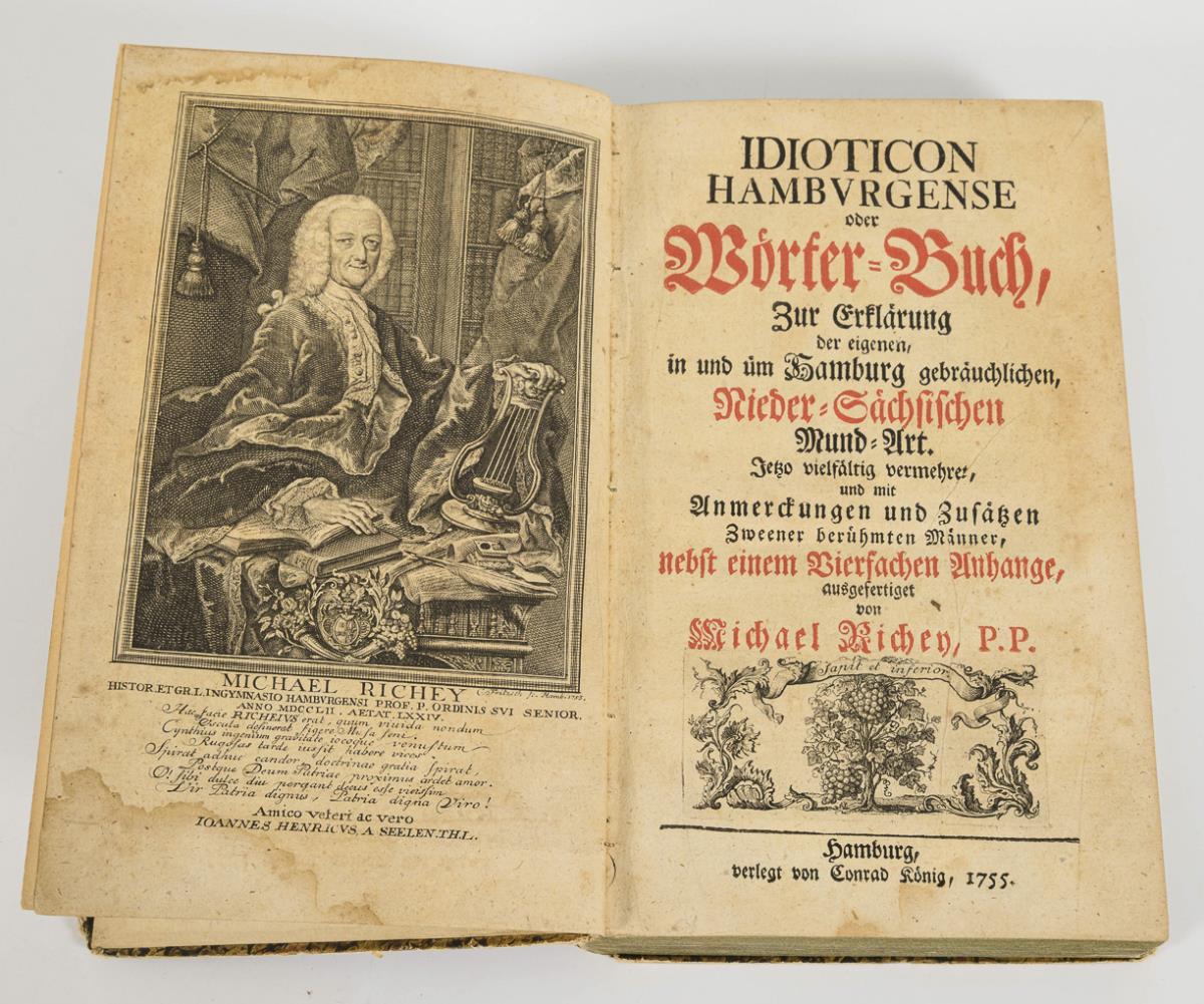 "Ansichten der Freien Hansestadt Hamburg und ihrer Umgebung" 2 volumes, Frankfurt am Main 1824, 1828, by Hübbe and Plath. 342, 438 pages in half leather binding / Michael Richen: "Idioticon Hamburgense oder Wörter-Buch. Zur Erklärung der eigenen, in und um Hamburg gebräuchlichen, Nieder-Sächsischen Mund-Art", Hamburg 1755, published by Conrad König. 52, 480 pages in paperback.