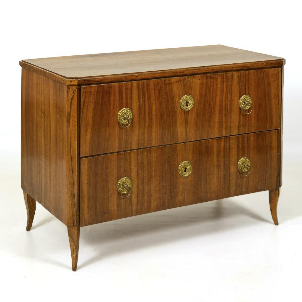 2-bay body with beveled corners, on slightly curved feet. Original locks, probably replaced, round profiled brass fittings with ring handles. Fully restored with a few veneer repairs, inactive anobia, slight signs of age and use.