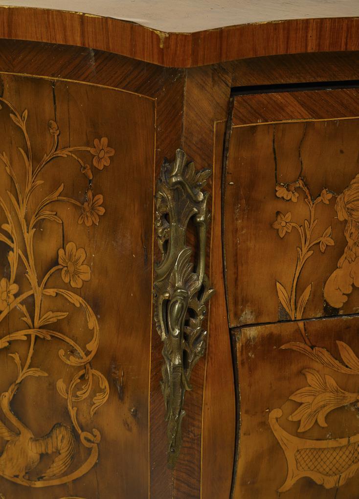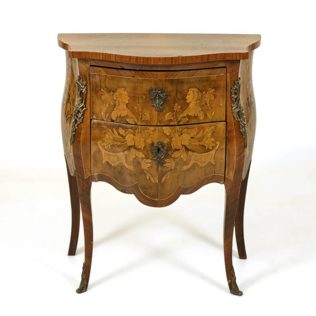 2-bay, cambered body with curved top and frame, on 4 slightly curved legs. Artistic floral inlay pictures on the fronts, drawers additionally with ladies' heads in profile, top panel with mirror veneer, floral bronze fittings. Signs of age and wear, veneer defects, slightly cracked.