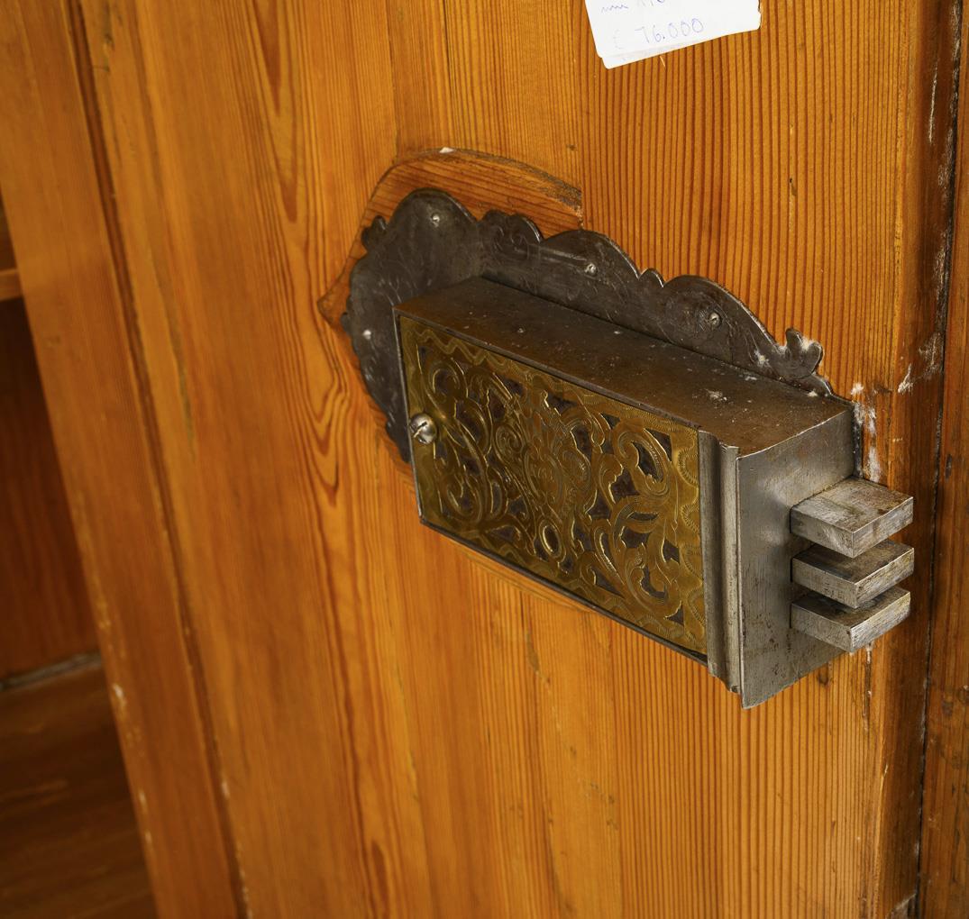 2-panel cabinet with cornice and drawer in a profiled plinth, on pressed ball feet. The doors, sides and rounded corners each with applied cassettes in wave form. The doors and the rounded corners each have a scalloped cassette. À-jour worked and brass keyhole panels with rocailles, baroque wrought iron box lock with 3 bolts, brass cover plate with rocailles á-jour worked and engraved and date "1751" in a central cartouche. The interior with more recent compartment divisions. Restored with minor additions, minimal defects and some traces of soldering on the fittings.