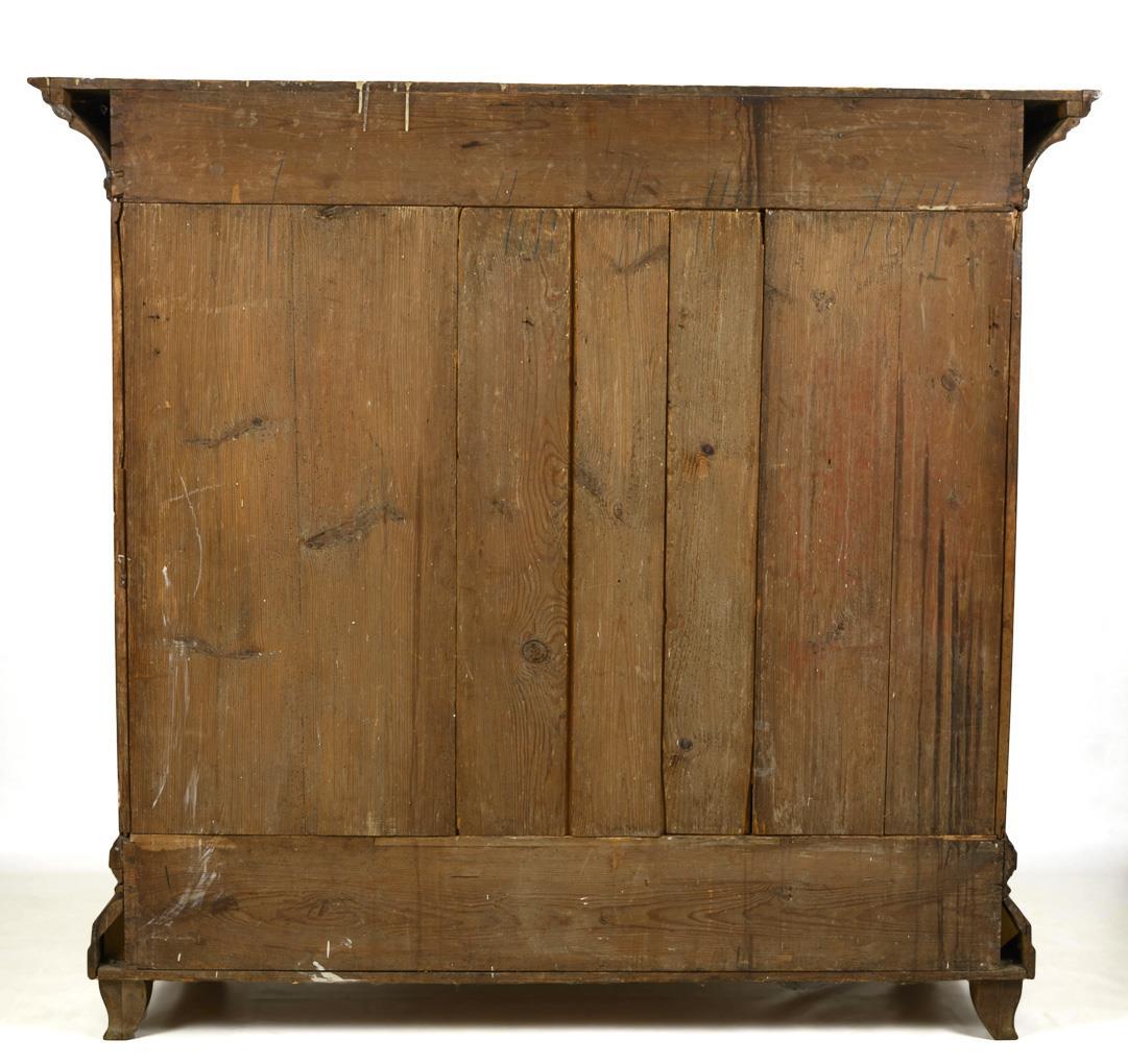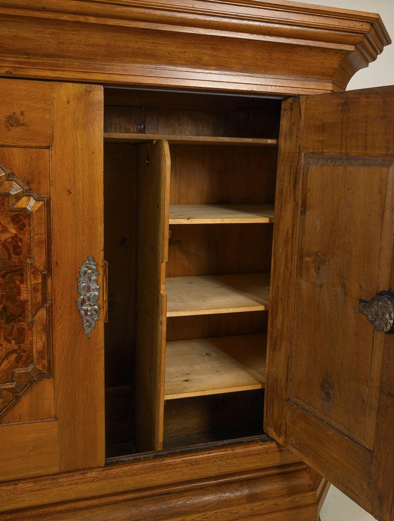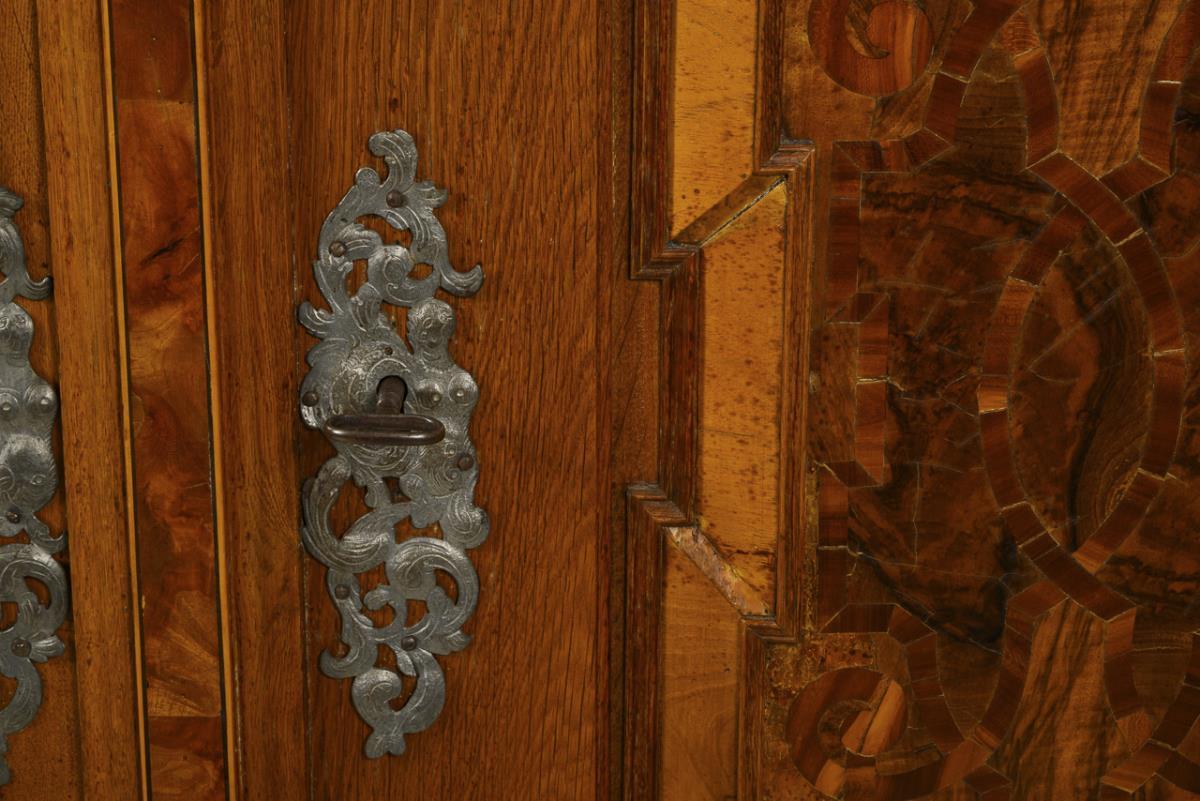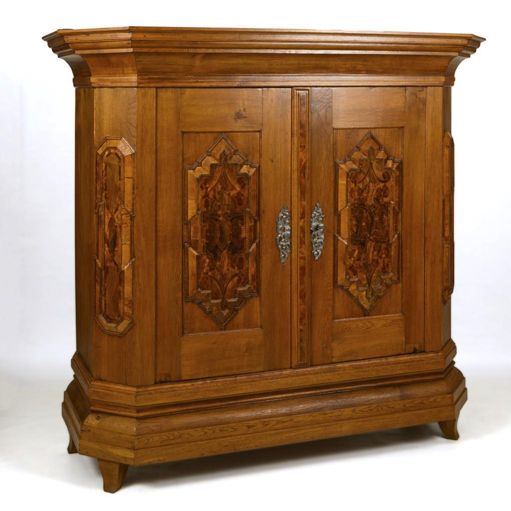 2-door Baroque cabinet with beveled corners, cornice and profiled plinth zone, on conical block feet. Doors and sides with applied, partly pointed coffering. Vegetable-cut, chased and engraved keyhole panels, probably original lock with similar decoration on the lock cover and 2 latches. Inside, more recent compartmentalization. Fully restored, with additions, slight repairs, inactive anobia, slight signs of age and use.