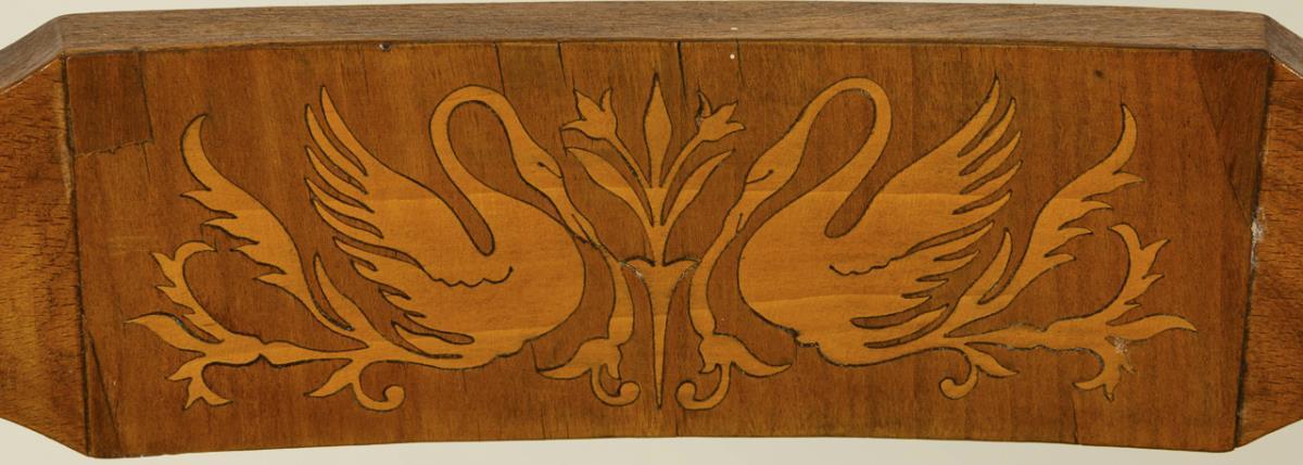 Pair of chairs with curved shoulder and center board, upholstered seat with green-beige velvet cover, 2 pointed legs at the front, slightly curved back legs. 1 wicker chair with straight shoulder board, center bar with swan marquetry, seat with Viennese wickerwork, on 4 curved legs. 1x minor repairs to the marquetry, slight signs of age and wear.