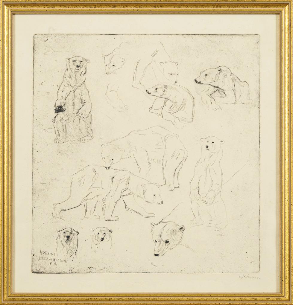 Print reproduction of a study sheet of polar bears, in various postures and stages of elaboration, signed "WKlemm/Hellabrunn .8.18".