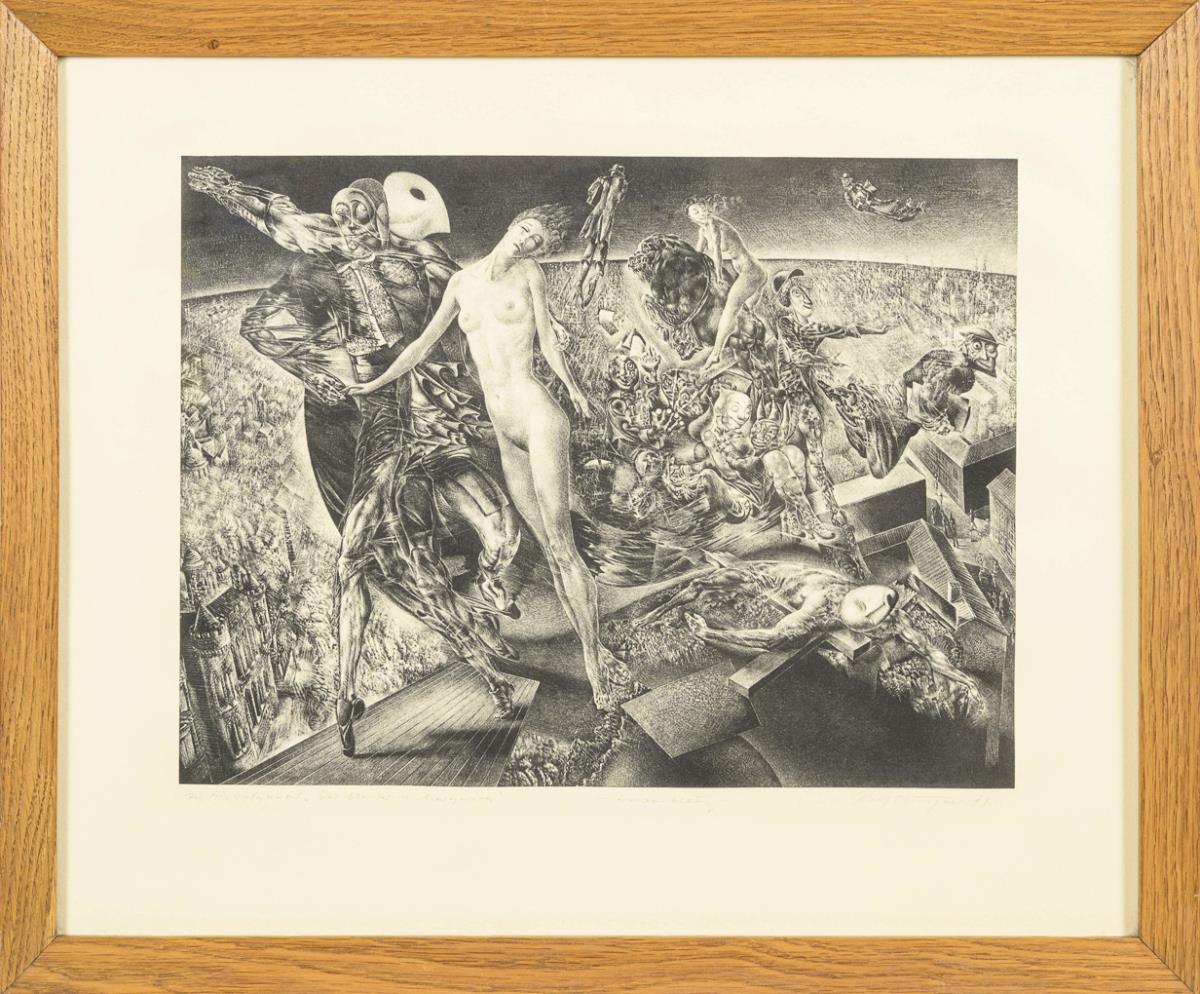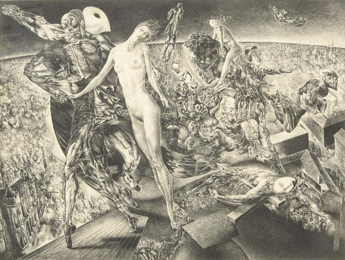 "To M. Bulgakov "The Master and Margarita". Surrealistic composition of a human-like figure carrying a young woman (nude).