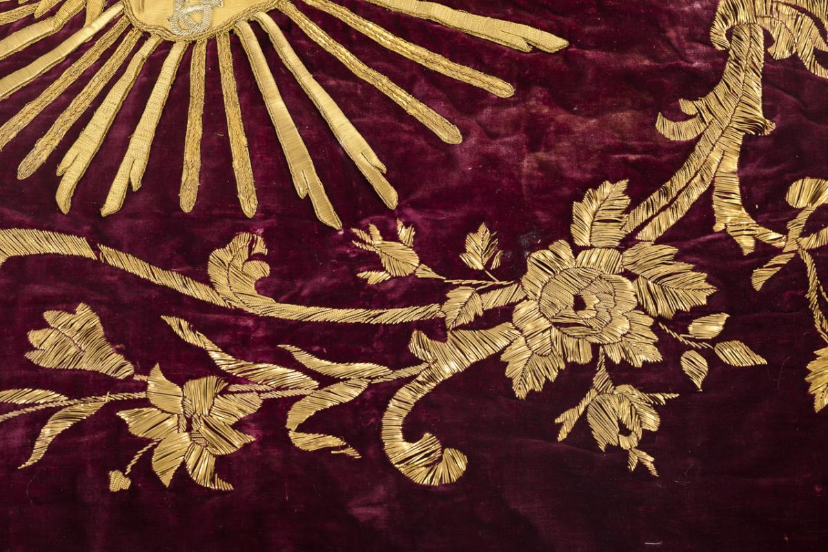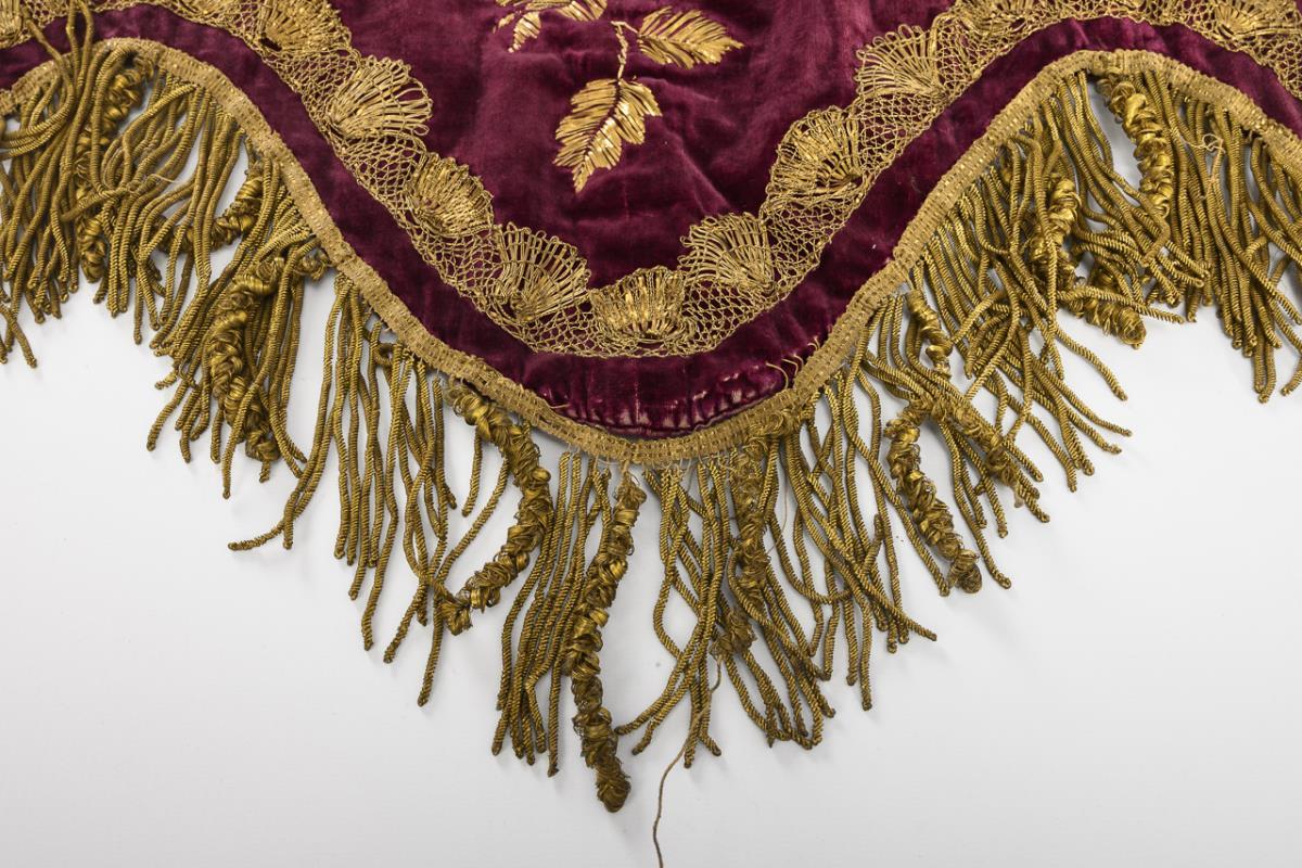 Violet velvet, embroidered with lahn, lahn threads and cantilles, partly in satin stitch. 149 x 92 cm.