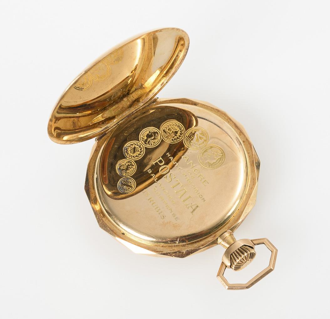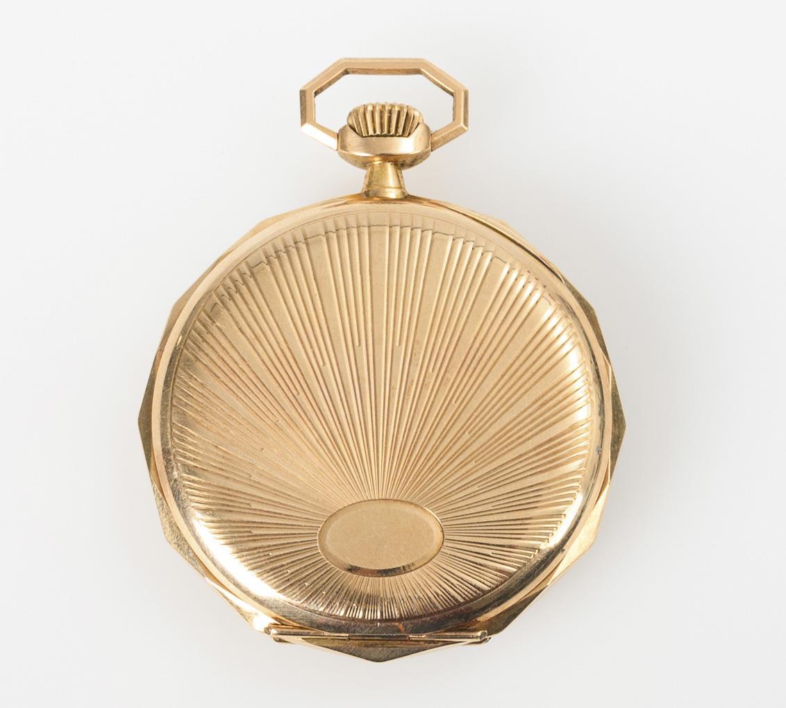 Flat lepine case with faceted rim and octagonal bow, back cover with radiating decoration, gold dust cover. Slight signs of wear and age.
