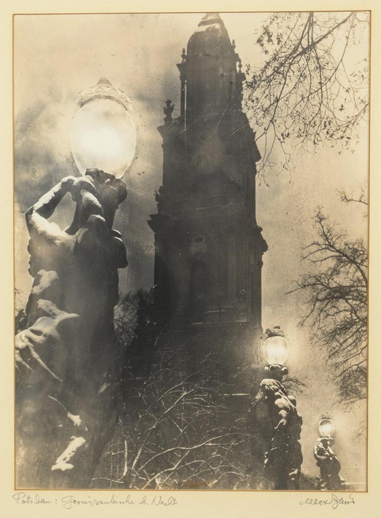 Photograph of the Garrison Church in Potsdam at night as a silhouette, view from the Breite Brücke, focus on the illuminated street lamps in the foreground; between 1928 and 1944.