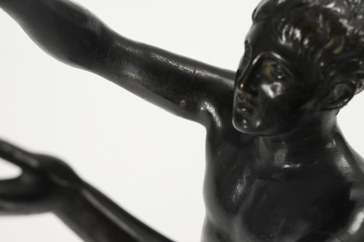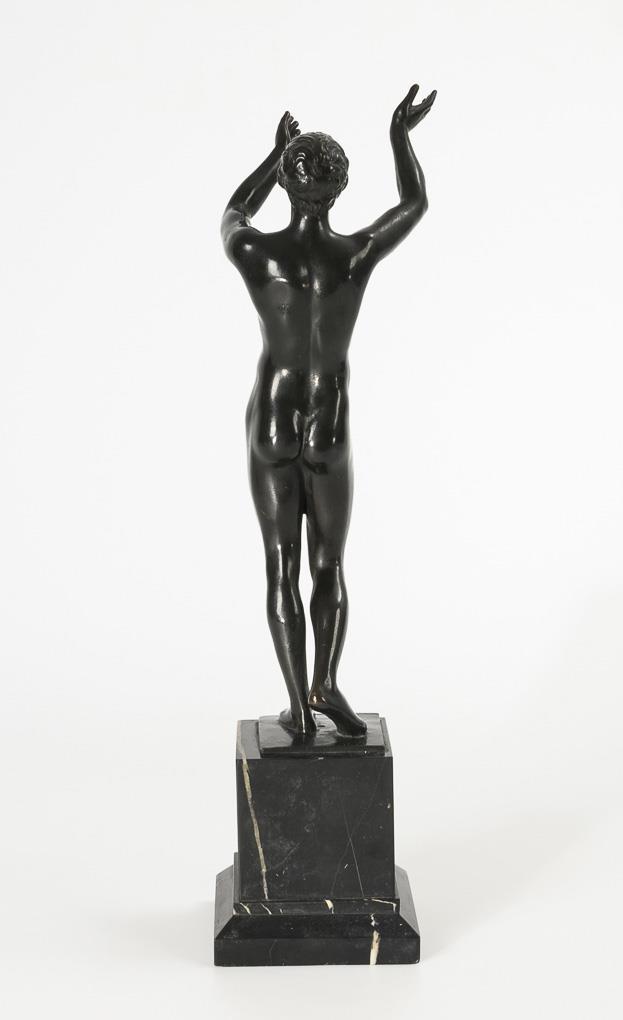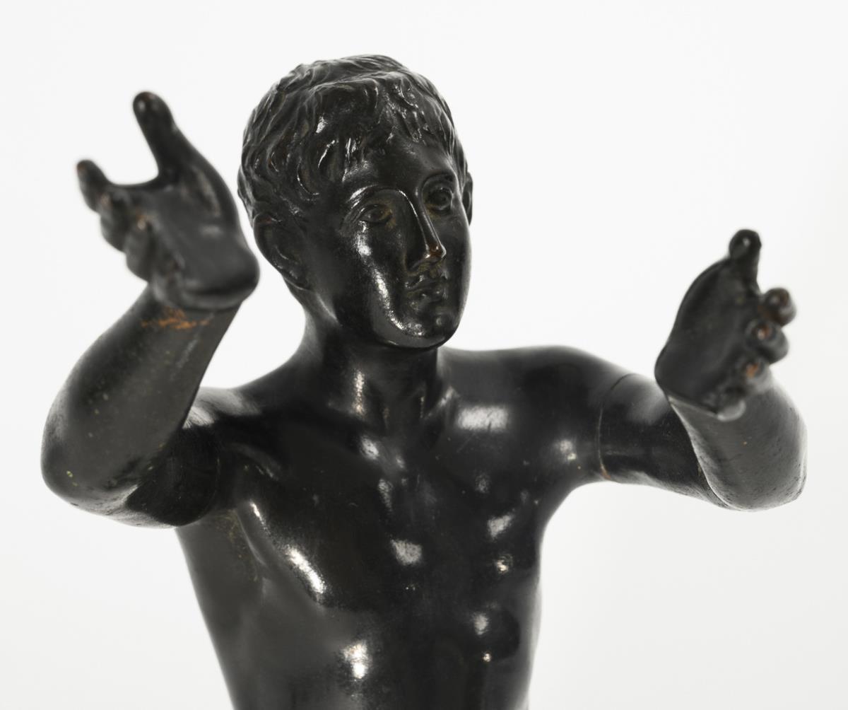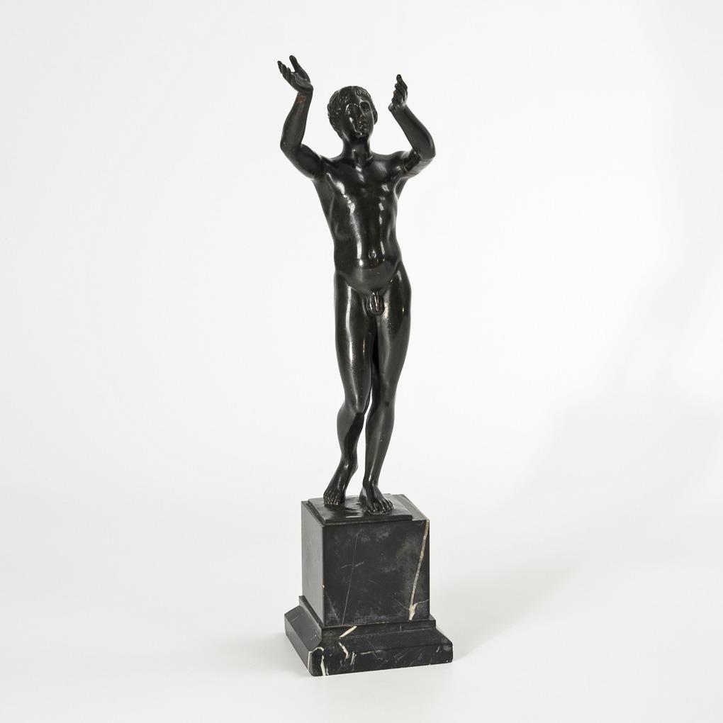 Adorant standing with raised hands. After the famous antique bronze figure that Frederick II had erected in front of his study in Sanssouci and in which Antinous was believed to be recognizable. Today the antique bronze is in the Altes Museum in Berlin. Hairline cracks on the arm seams and on one elbow, slightly rubbed patina, minor chips to the marble.