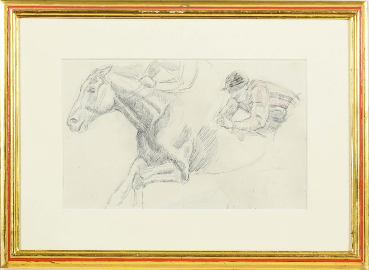 Study sheet of a horse with indicated mounted jockeys, next to it a sketch of the upper body of a rider.
