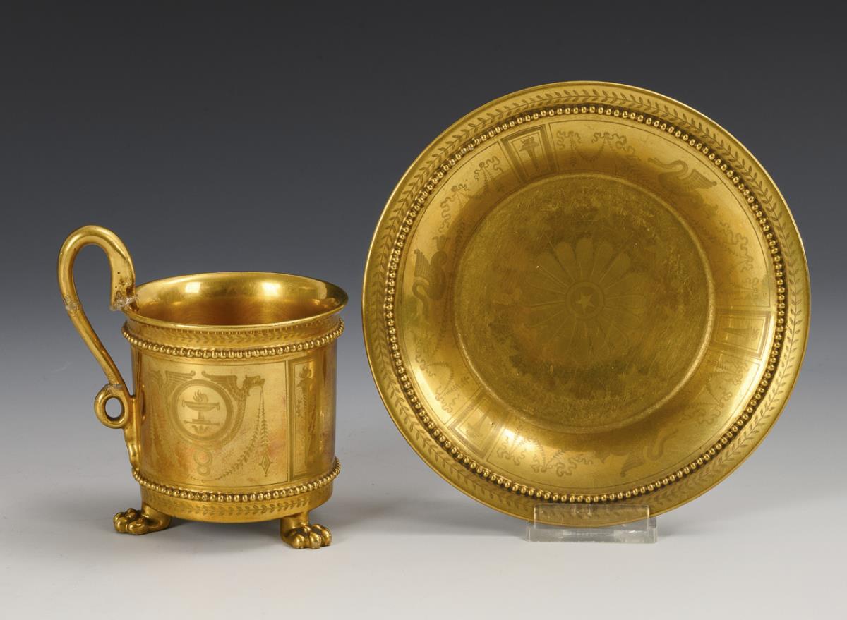 Cylindrical cup with pearl bands, three paw feet and swan handle. Golden background with etched symbols. Handle glued.