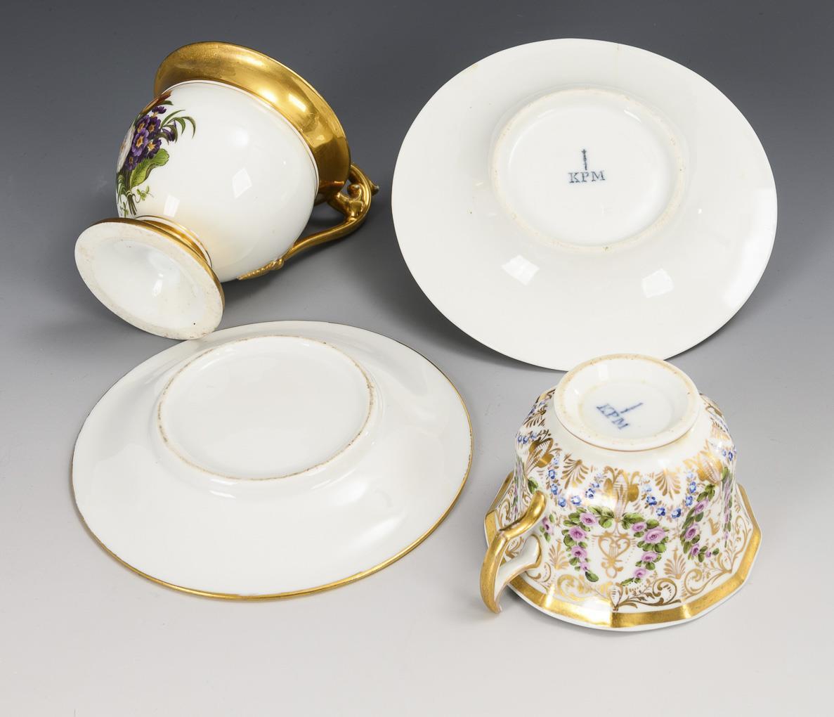 1x KPM BERLIN, 1837-1844: polygonal bell-shaped cup (h 6 cm) with pointed curved handle and original saucer (Ø 15 cm), rose and forget-me-not painting as well as floral gold decoration and the dedication "Sei fromm und gut / Von Deiner Großmutter. C. K. 1842.". / 1x unmarked: footed bell-shaped cup (H 10.5 cm) with palmette handle and added saucer (Ø 14 cm), on the front of the cup a bouquet of flowers. Haarriss in 1 saucer, minimal gold abrasion.