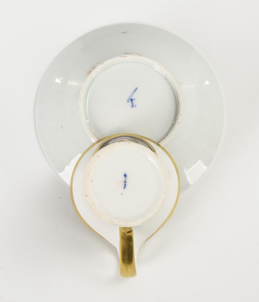 Polychrome painted, decorated in gold. Cup (h 9 cm), completed saucer (Ø 13.5 cm).