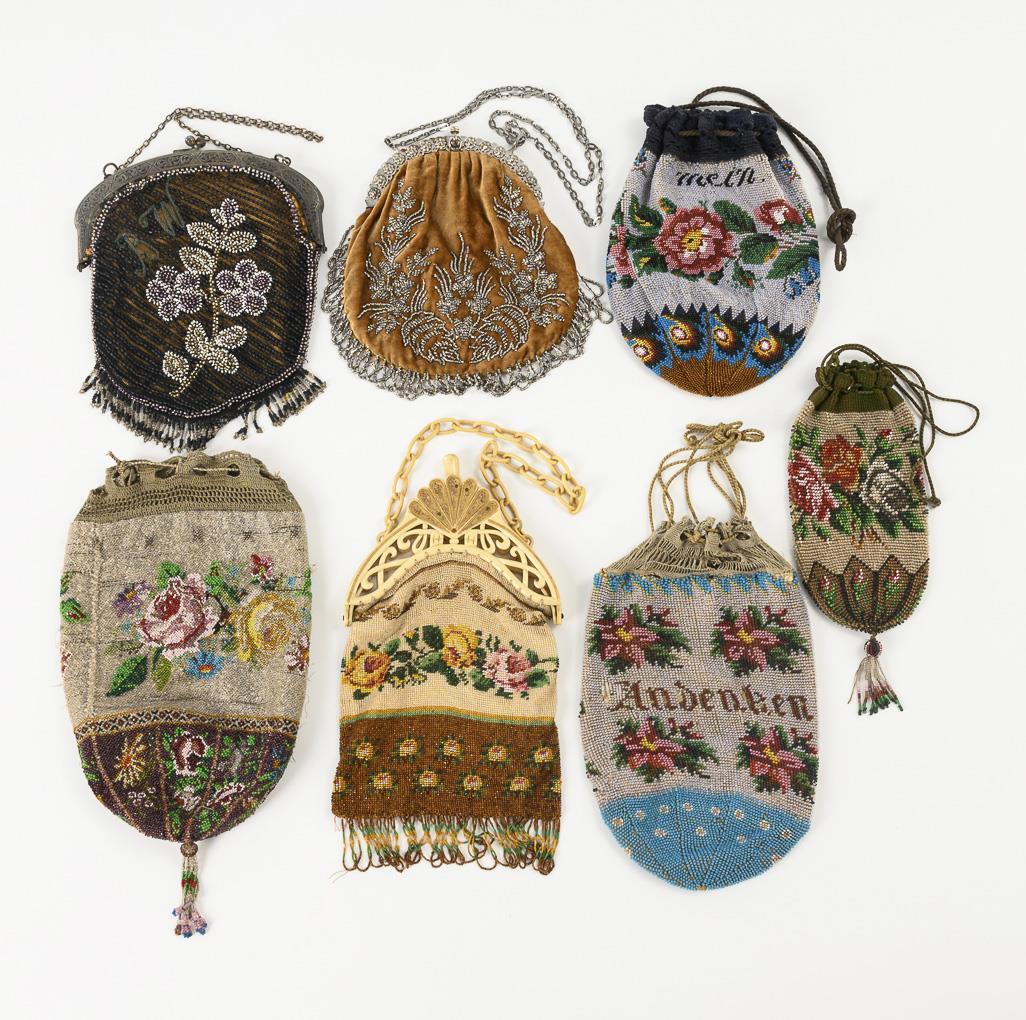 6x colored bead embroidery, 1x chrome-plated iron beads on fabric, mostly with fabric lining, 1x made of leather. Mounts: Metal, chrome-plated iron, imitation ivory made of plastic. Maximum size 25 x 16 cm.