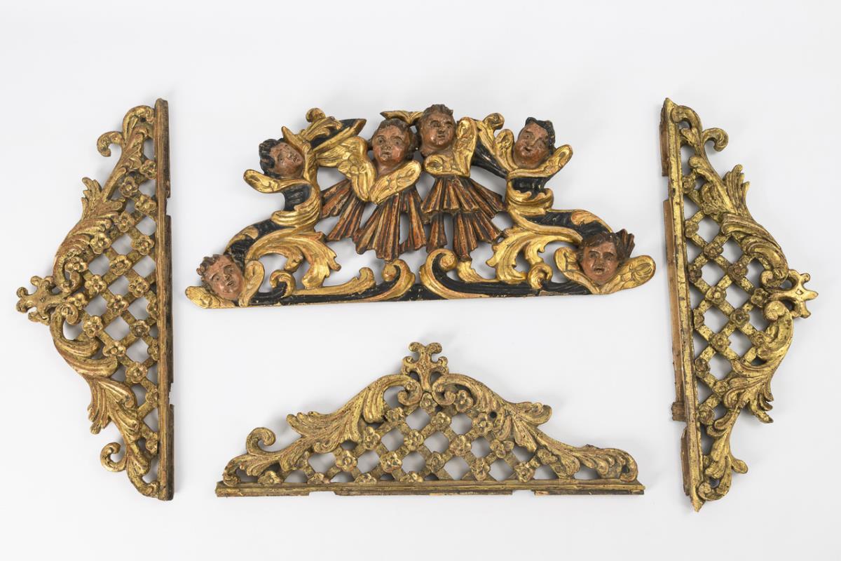 Three sets of small supraports with floral latticework and acanthus, crowned with an anchor cross / 6 angels' wings with variously designed angel heads on black/gold acanthus tendrils. 3x traces of use, 1x old repair and missing crowning, each with traces of age/use.