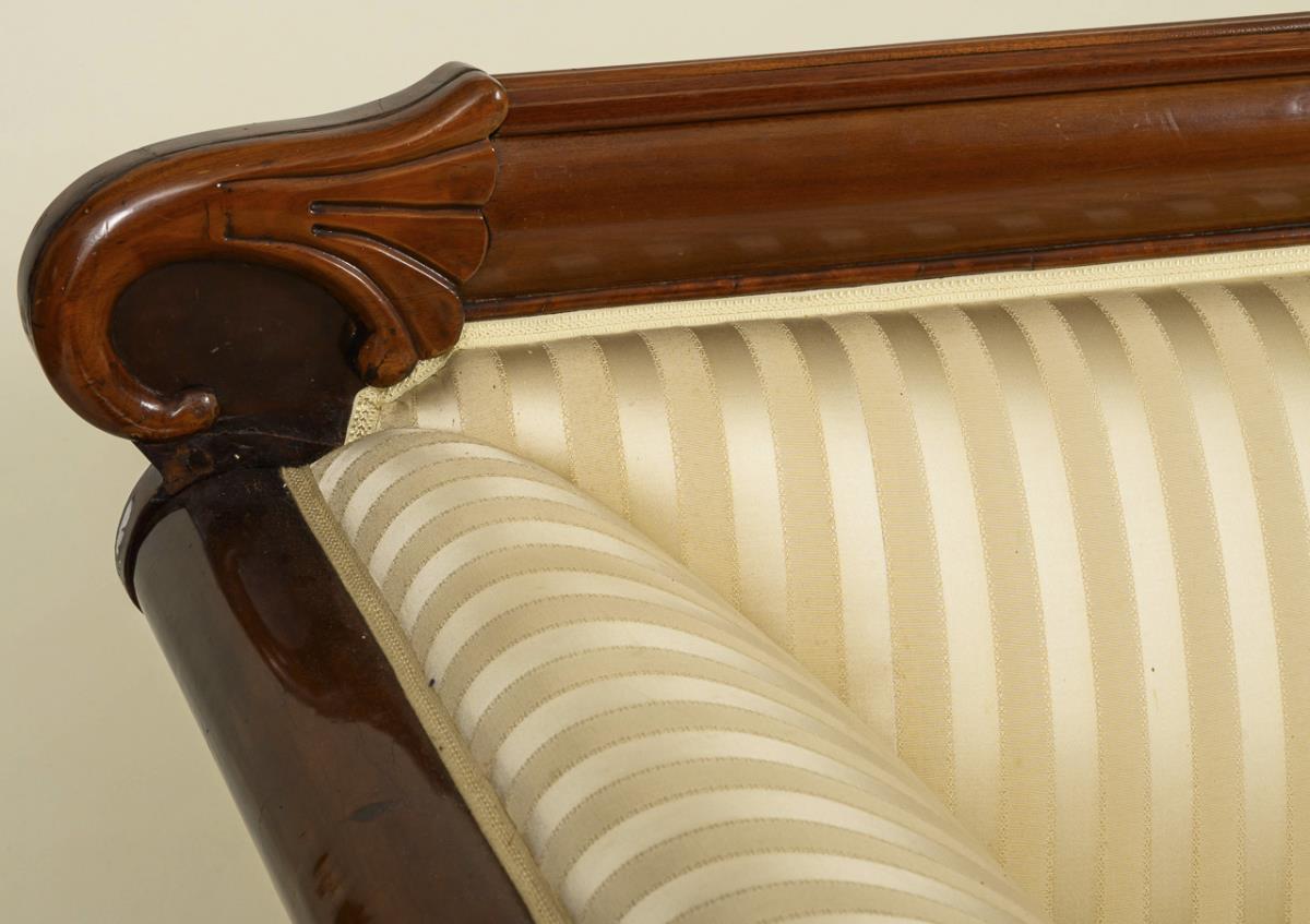 Straight backrest with carved horns, S-shaped curved and voluted side rests, curved frame and 4 curved feet. Younger upholstered and covered with beige striped fabric. Restored.