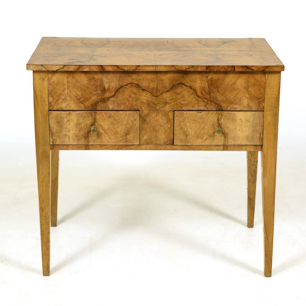 2-tier body with hinged top on a high frame, on 4 tapered square legs. Mirror glass mounted inside and large hollow compartment with light red fabric. Restored, with additions, mirror glass with detached mirroring and minor blind spots.