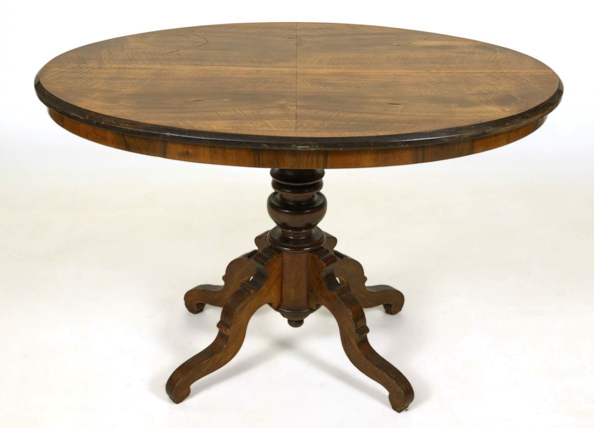 Oval table on a turned stem and 4 curved legs, mahogany, solid and veneered, stained walnut, 75 x 116.5 x 84.5 cm. 6 chairs with balloon backrests, curved front, rounded frame on the back, upholstered seat with yellow, classicist patterned jacquard fabric cover, on 4 curved legs, solid beech, stained walnut, h 91 cm. Slight signs of wear.