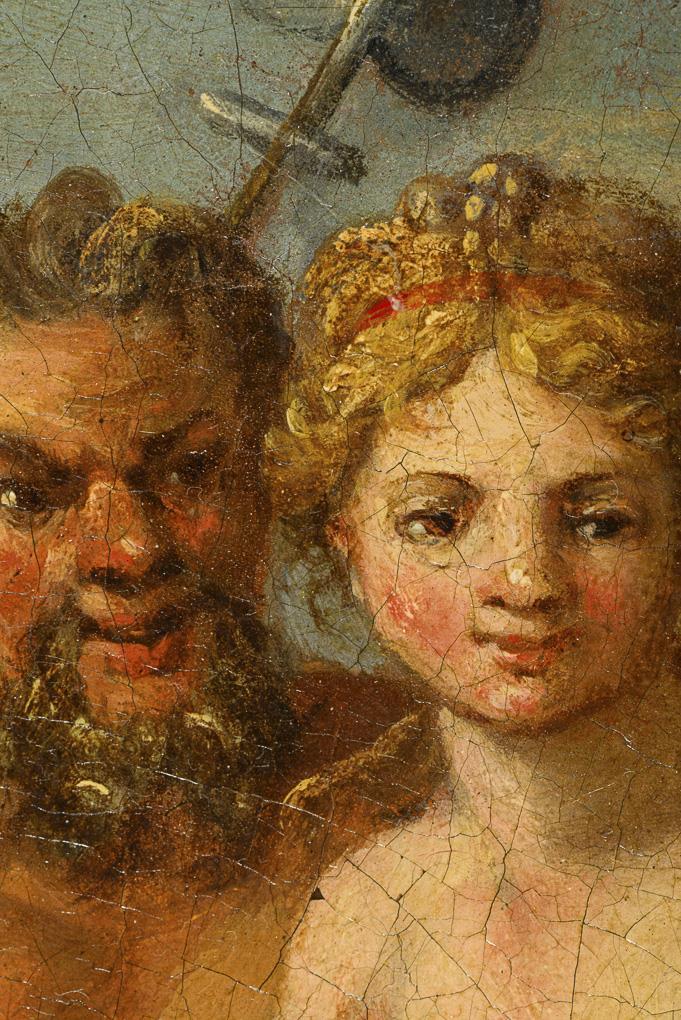 The couple with a young faun and a dog in a sunny mountain landscape. Doubled canvas.