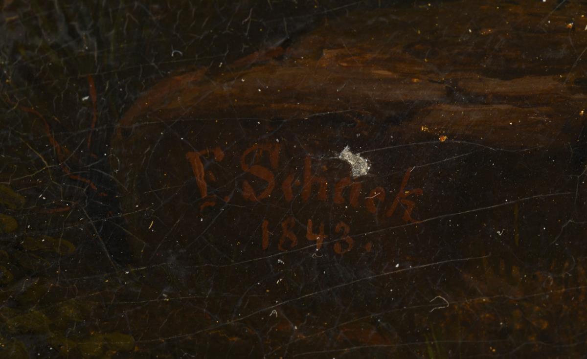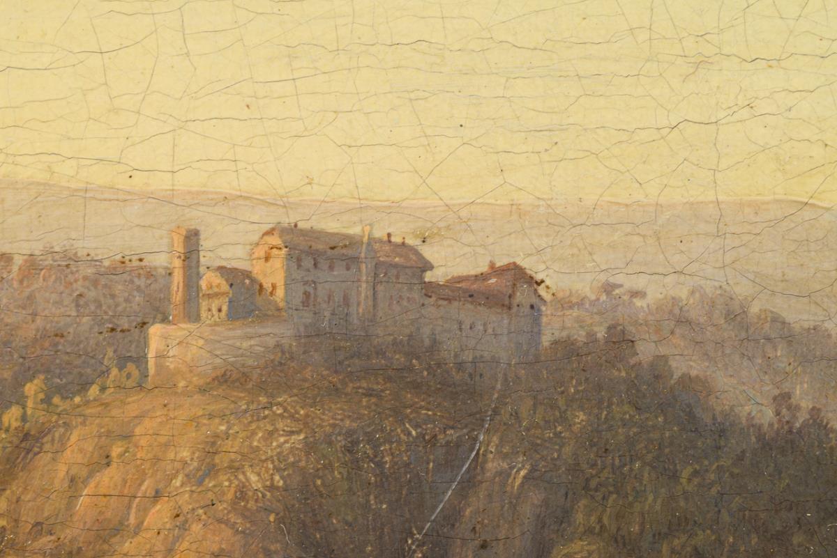 Atmospheric mountain landscapes with staffage figures near castles in the warm sunshine. Each canvas relined.