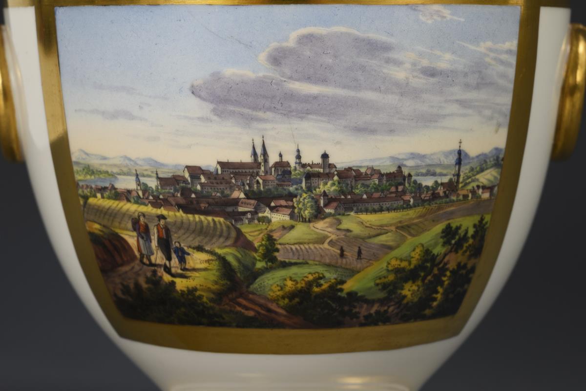 Semi-ovoid, footed box with two ring handles and pommel lid. On the front a gold-framed rectangular cartouche with the inscribed view of the town of Freysing in Upper Bavaria.