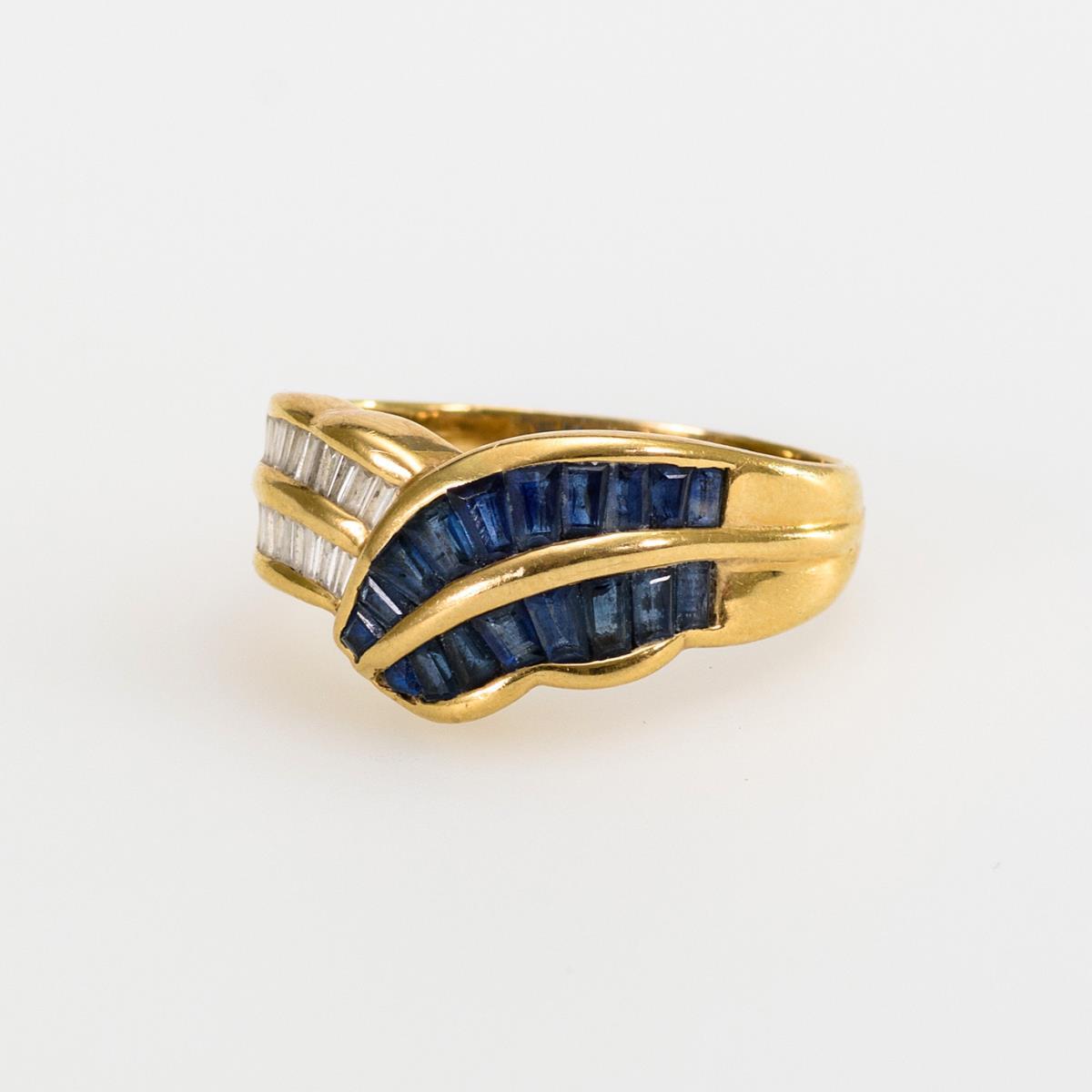 18 kt GG. 7 g. Breiter Bandring mit eingelassenen Saphir- und Diamantbaguetten. Ý 20 mm/Rg 63..