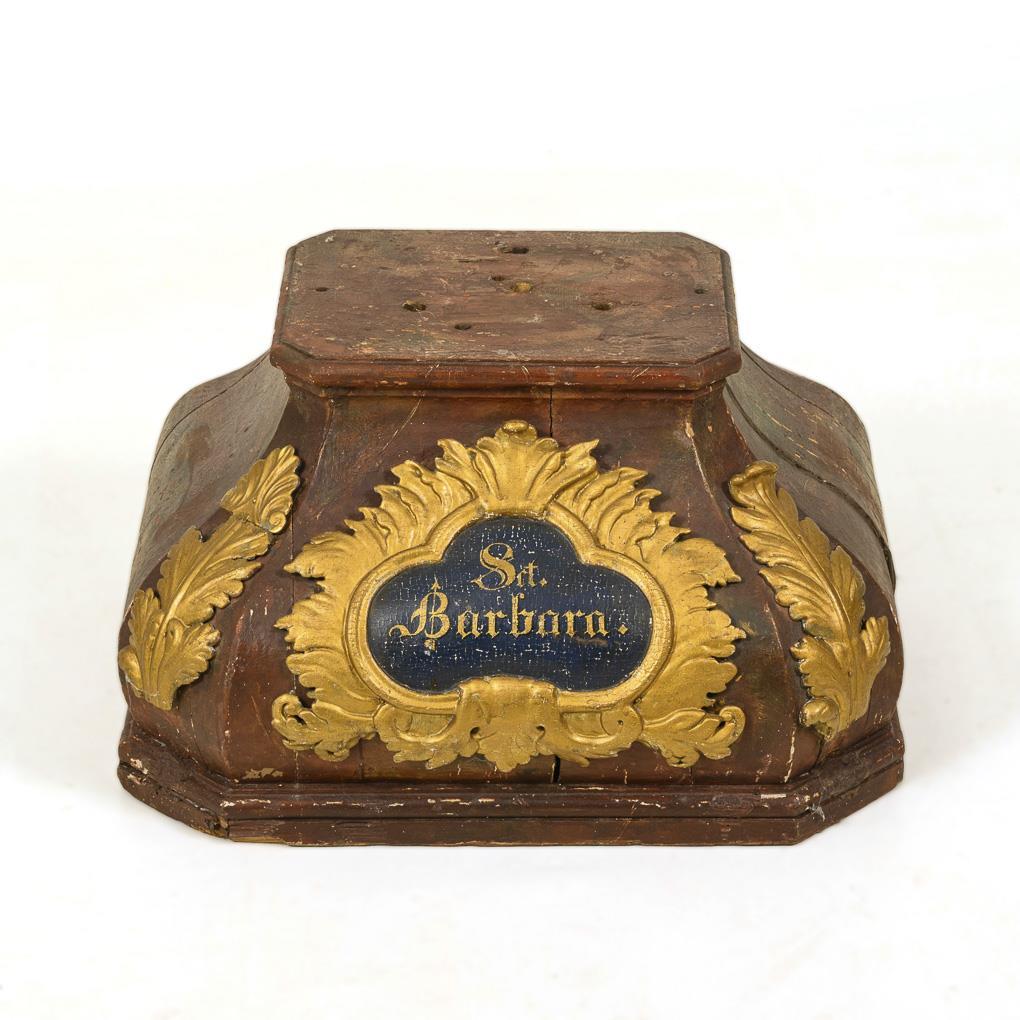 Baroque-style cushion-shaped base with acanthus appliqués and title cartouche. In need of restoration, minor losses.