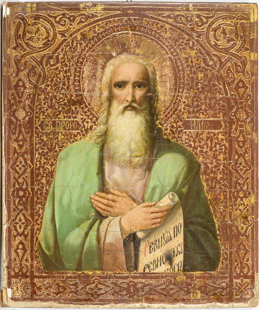 Saint with scroll and arms crossed over his chest. Traces of age.