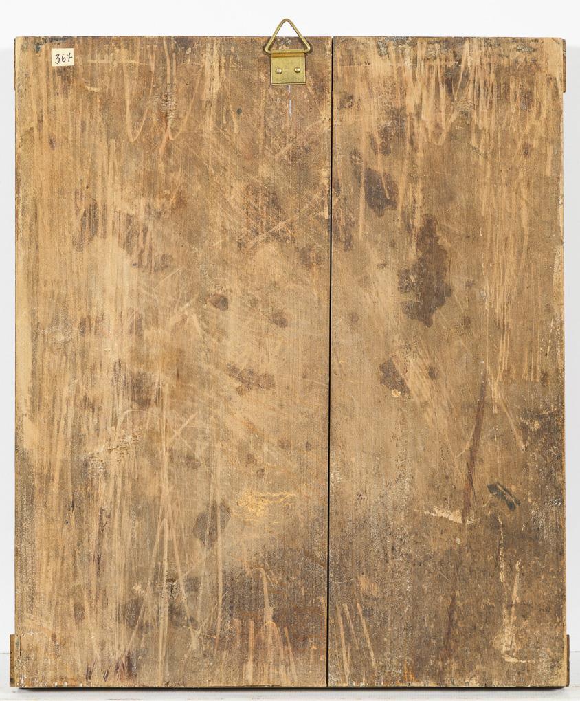 The saint with open Holy Scripture and gesture of blessing. Significant traces of age.