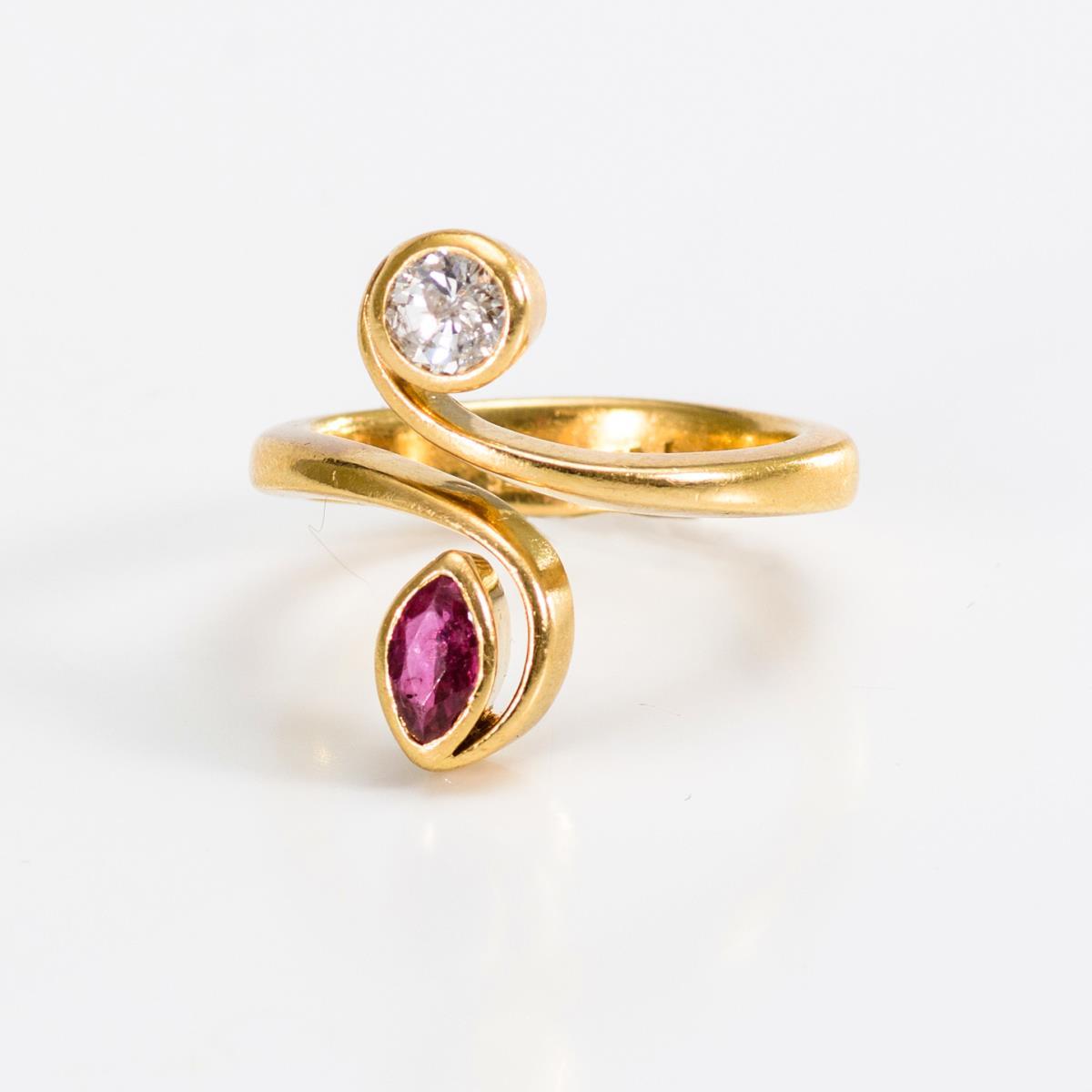 18 kt GG. 10,72 g. Zargengefasster Brillant (ca. 0,43 ct/G-H/PI-PII) und Rubinnavette (ca. 0,38 ct) in gegenläufigen Voluten-Enden. Massive Schiene. Ý 18,5 mm/Rg 58. Rubin geprüft, nicht behandelt/Brillant geprüft. G Wertermittlung laut Gutachten von 2018: 5.570,00 Euro..